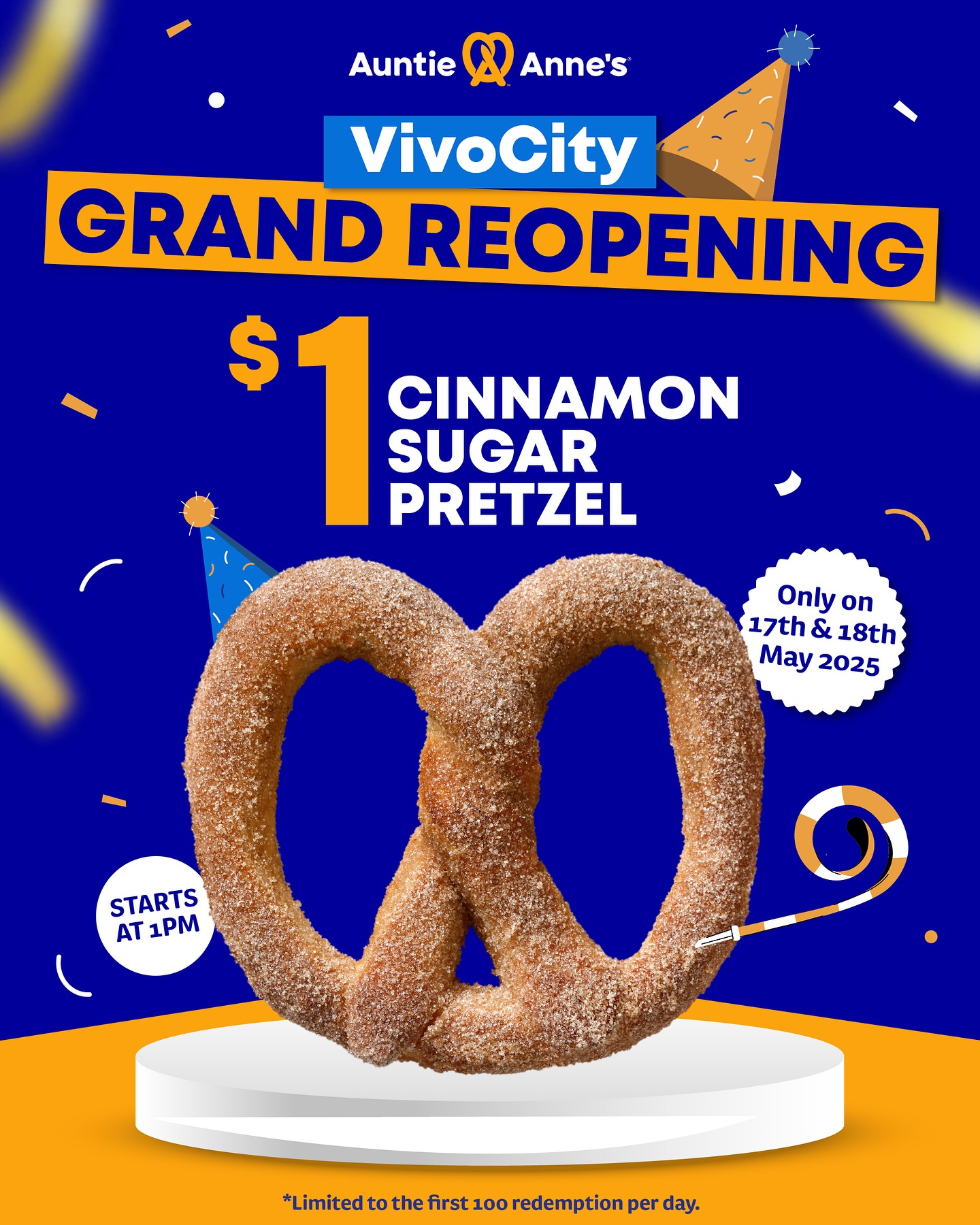 Auntie Anne’s will be having their grand re-opening at VivoCity, and to celebrate, they’ll be offering their iconic Cinnamon Sugar Pretzels for just $1 each (UP. $4.30 each). The $1 pretzels will be available only for 2 days, from 17th to 18th May 2025, exclusively at their newly-reopened VivoCity outlet.