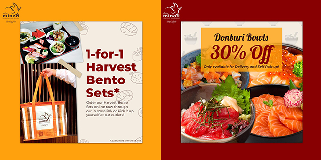 Get 30% off Shin Minori’s scrumptious donburi bowls, and 1-for-1 promotions on all Harvest Bento sets when you order takeaway or delivery! Worth an estimated $24.90 to $31.90, the Shin Minori Harvest Bento sets is available in the following variations – Chirashi Sushi, Sushi to Kani Karaage, Sashimi to Tempura, Tori Teriyaki to Shake Sashimi, Unagi to Shake Sashimi, Gyuniku Shogayaki to Nasu Dengaku, Gindara Saikyo Yaki, Buta Kimchi Ramen to Shake Sashimi, and vegetarian.