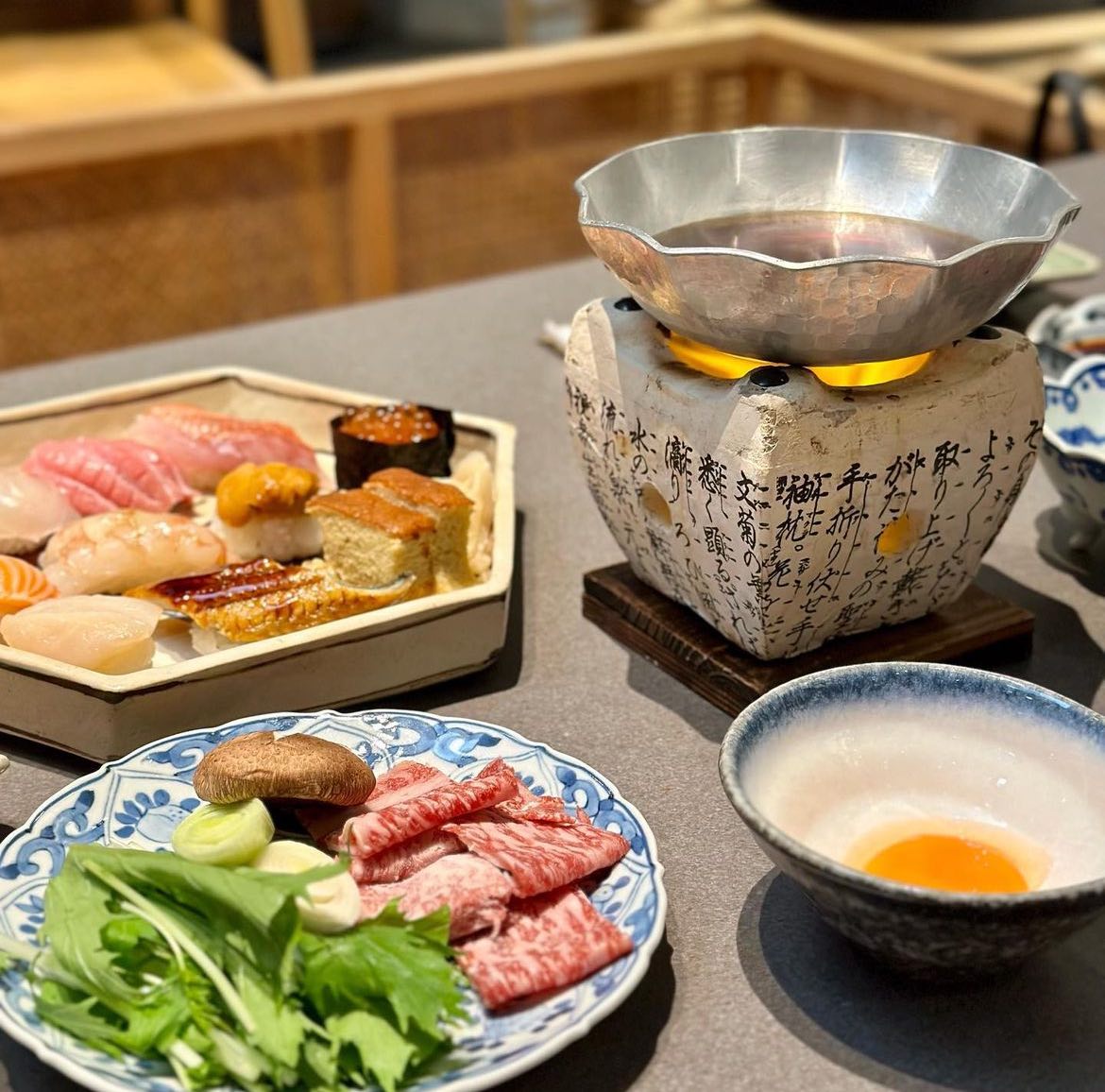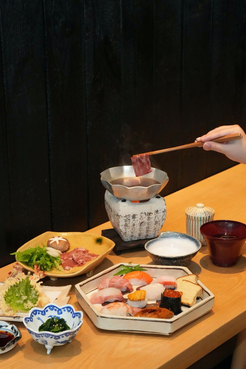 The 15-course omakase features your choice of mini Wagyu Beef or Amberjack Sukiyaki, a 10 pieces of sushi, Crispy Tempura, Chawanmushi, Side Dish and Miso Soup. Items served in the omakase may vary, but you can expect premium ingredients like uni, otoro, hotate, ikura, unagi, red snapper, red prawn and more.
