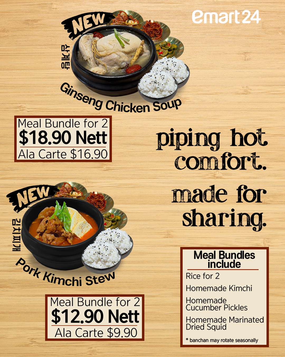 Looking for a hearty and affordable meal to soothe the soul? We’ve got just the spot for you, with comforting and sumptuous Korean meal bundles from just $6.45 nett! Emart24 is offering pocket-friendly meal bundles for 2 that includes a main, rice and homemade Korean sides!