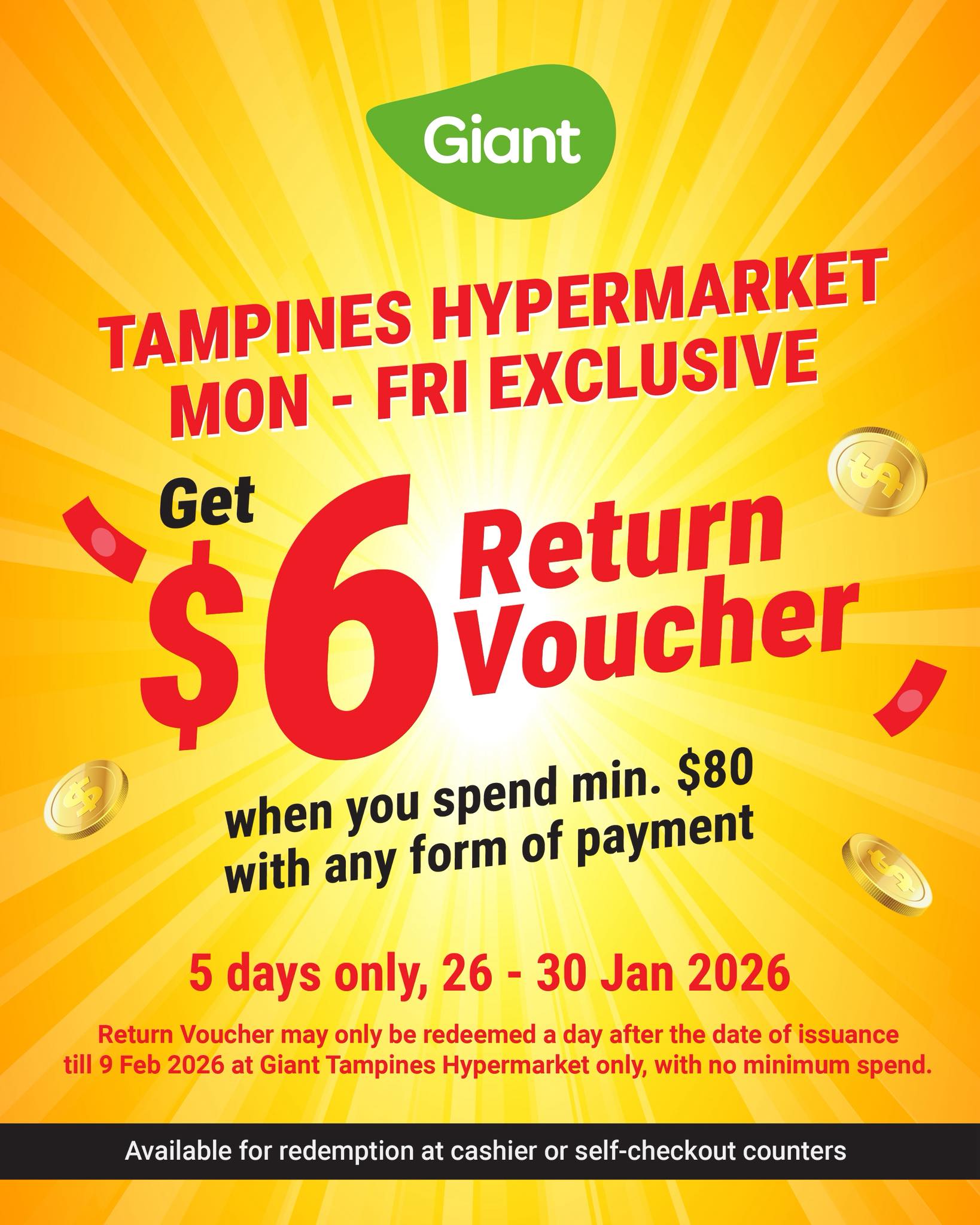 The $6 return voucher redemption is only available for 5 days from now till 30th January 2026, exclusively at Tampines Hypermarket. You can redeem the vouchers from Giant at both the cashiers and at the self-checkout counters.
