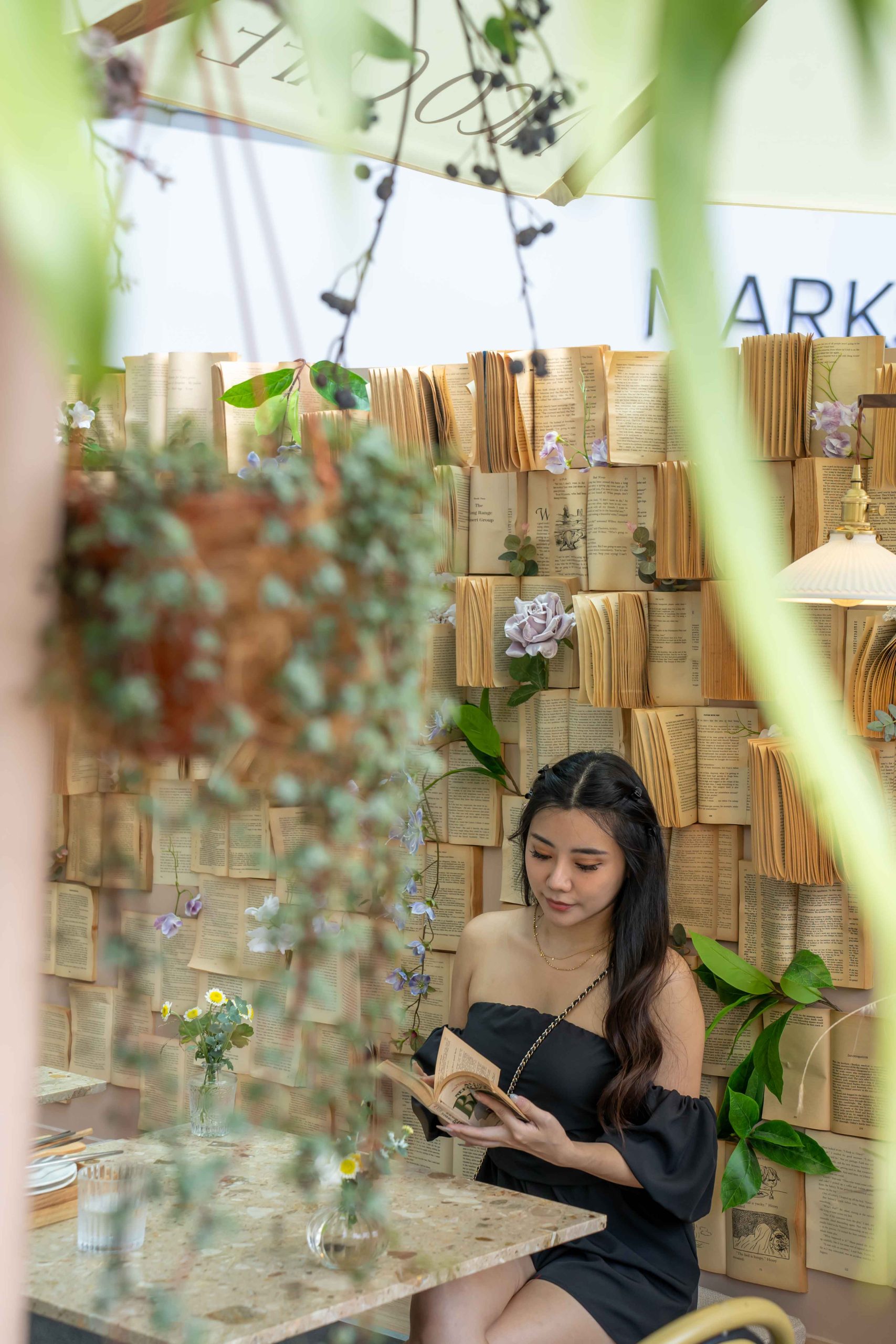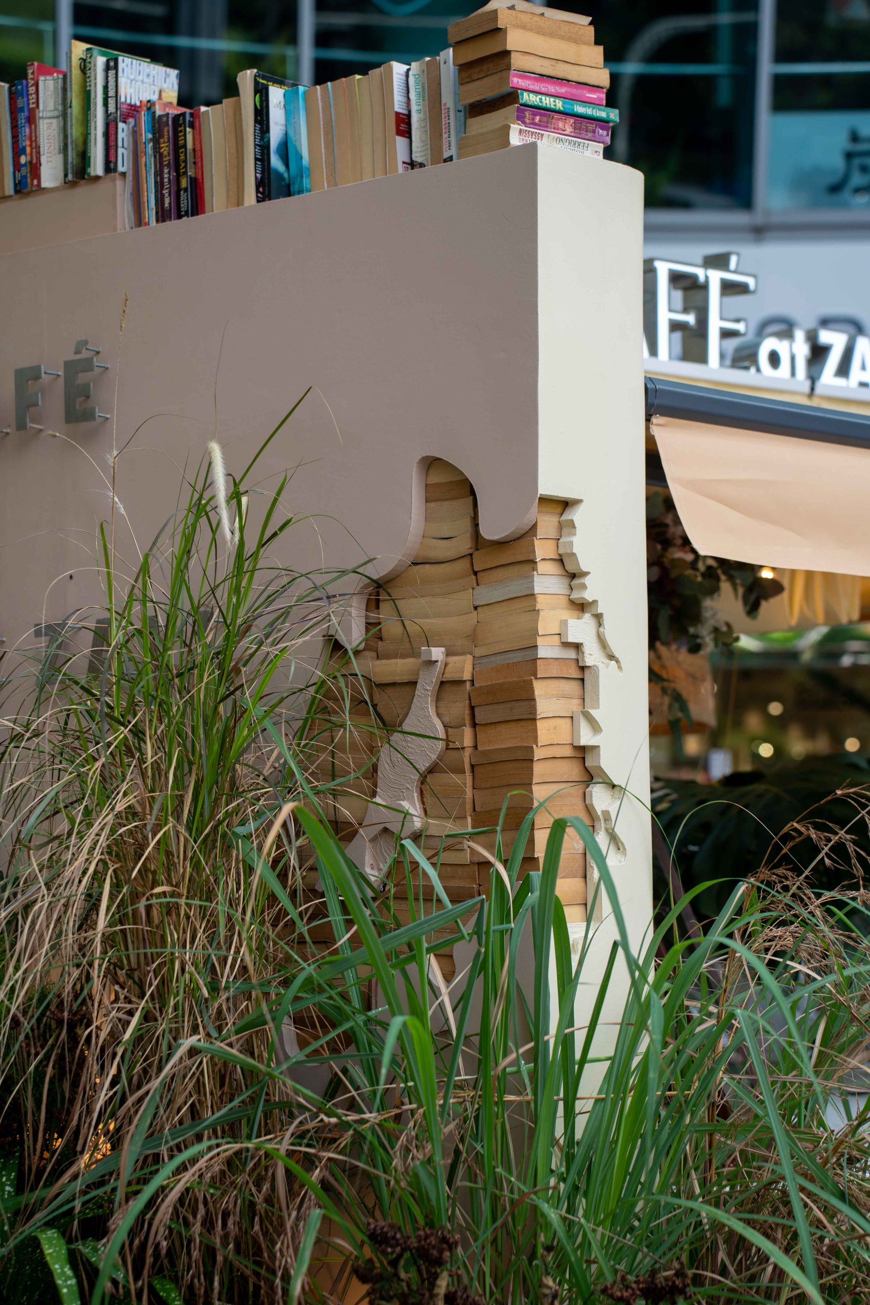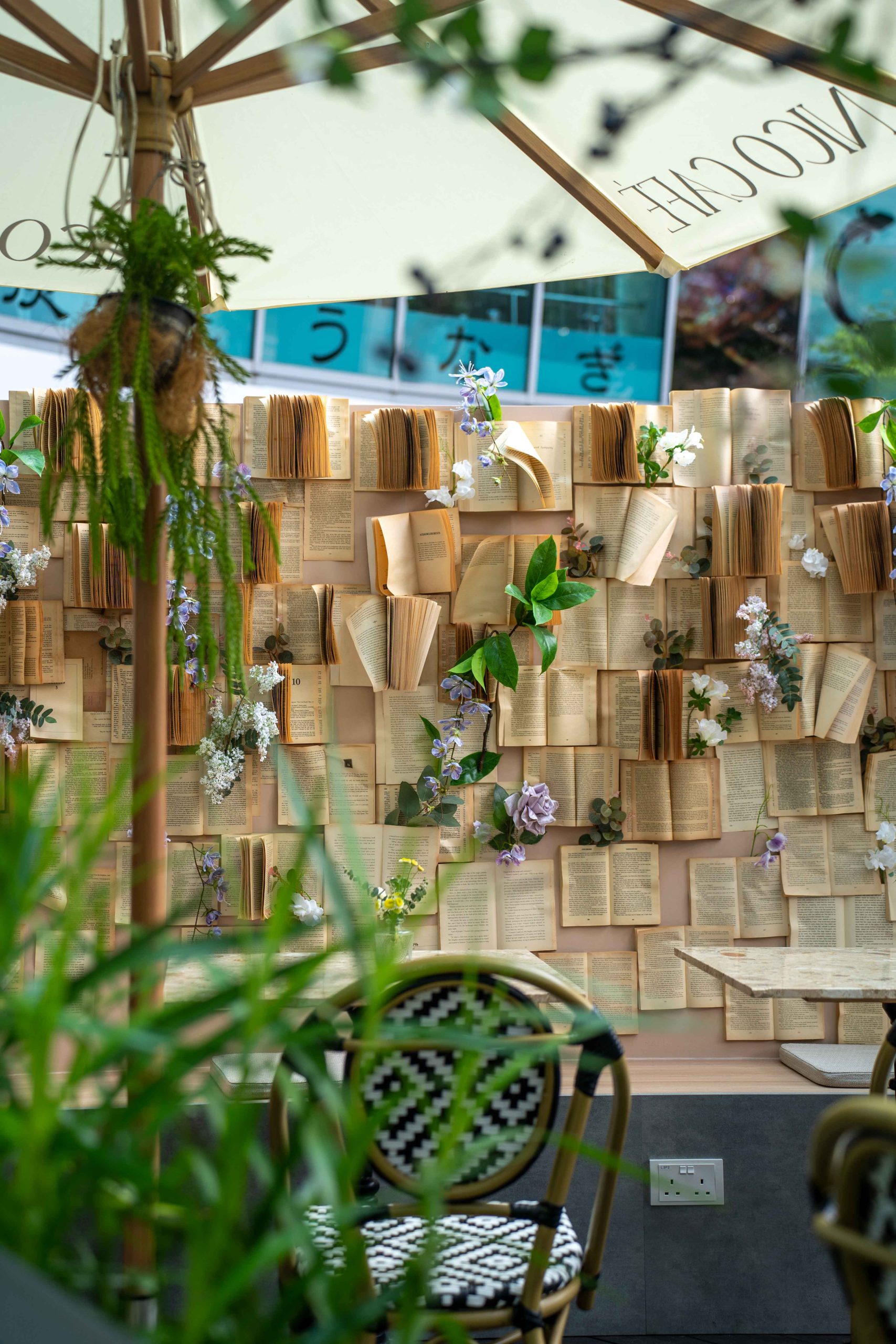Since it’s located outside a bookstore, they’ve also incorporated quirky book-themed elements into the decor, like embedding it into the walls, and having an entire wall of books as a backdrop!