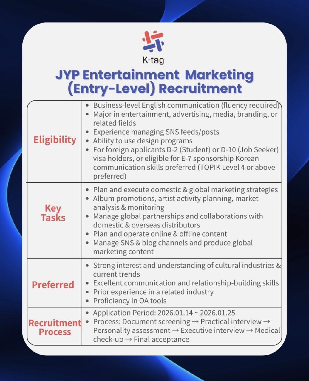 The role is based in Seoul, but foreigners are welcome to apply as well, especially if you’re fluent in English at a business level. For foreigners, feel free to shoot your shot, as long as you’re able to obtain a D-2 (student) or D-10 (job seeker) visa, or are eligible for E-7 sponsorship. Foreign applicants who have Korean language communication skills (TOPIK Level 4 or above) are preferred. For the full eligibility requirements and job description, see below: