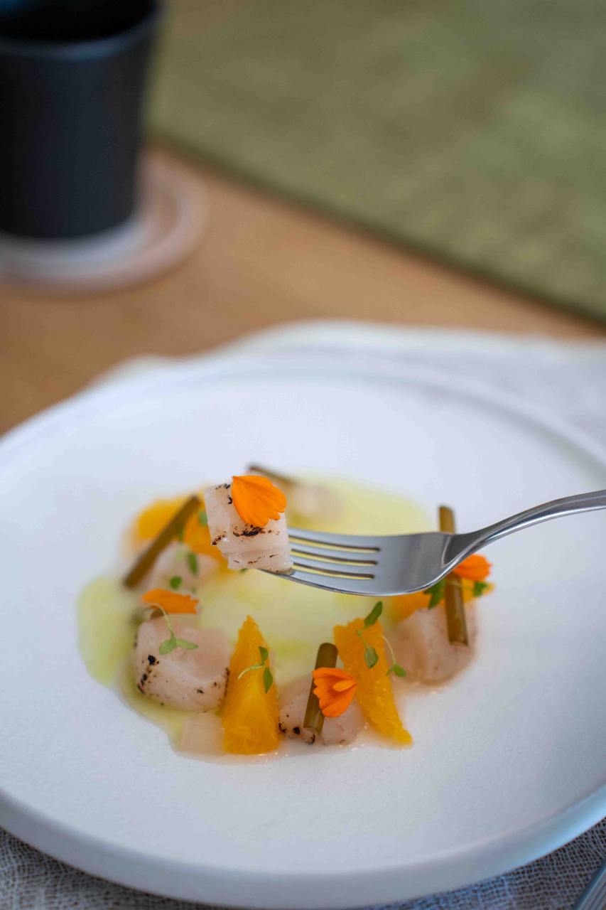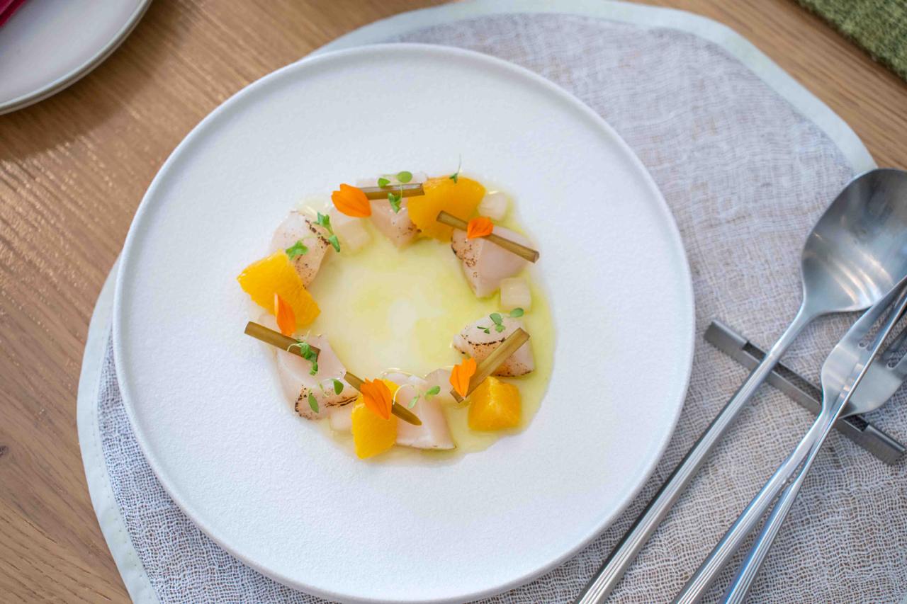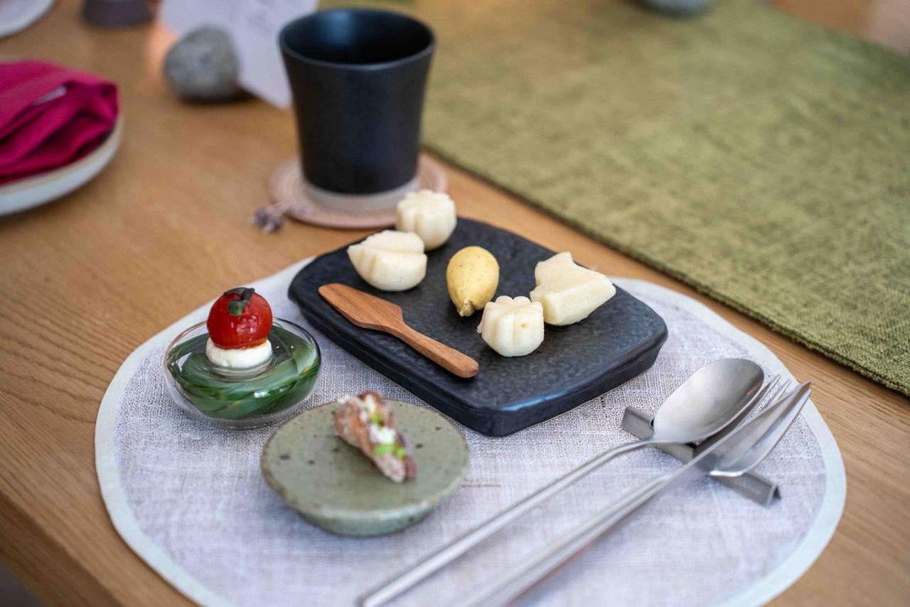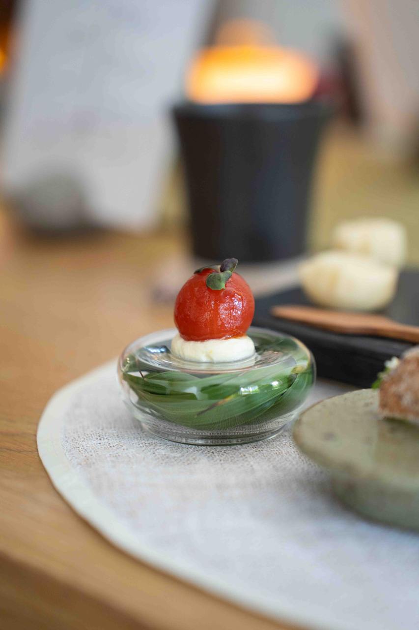 We started off the meal strong with a trio of Amuse Bouche that were meticulously made and intricately presented. The steamed Makgeolli Bread shaped like leaves and flowers had a unique chewy texture, much like glutinous buns, and had a unique tangy, fermented taste that paired well with the savoury and umami burnt corn butter. The Eggplant Rice Chip was one of our favourites from the appetiser set, with ultra crunchy fried eggplant shaped into a “taco” encasing a subtly herbaceous perilla hummus. The Maesil Tomato was juicy and oh-so-refreshing, made with green plum extract that takes an entire year to make!