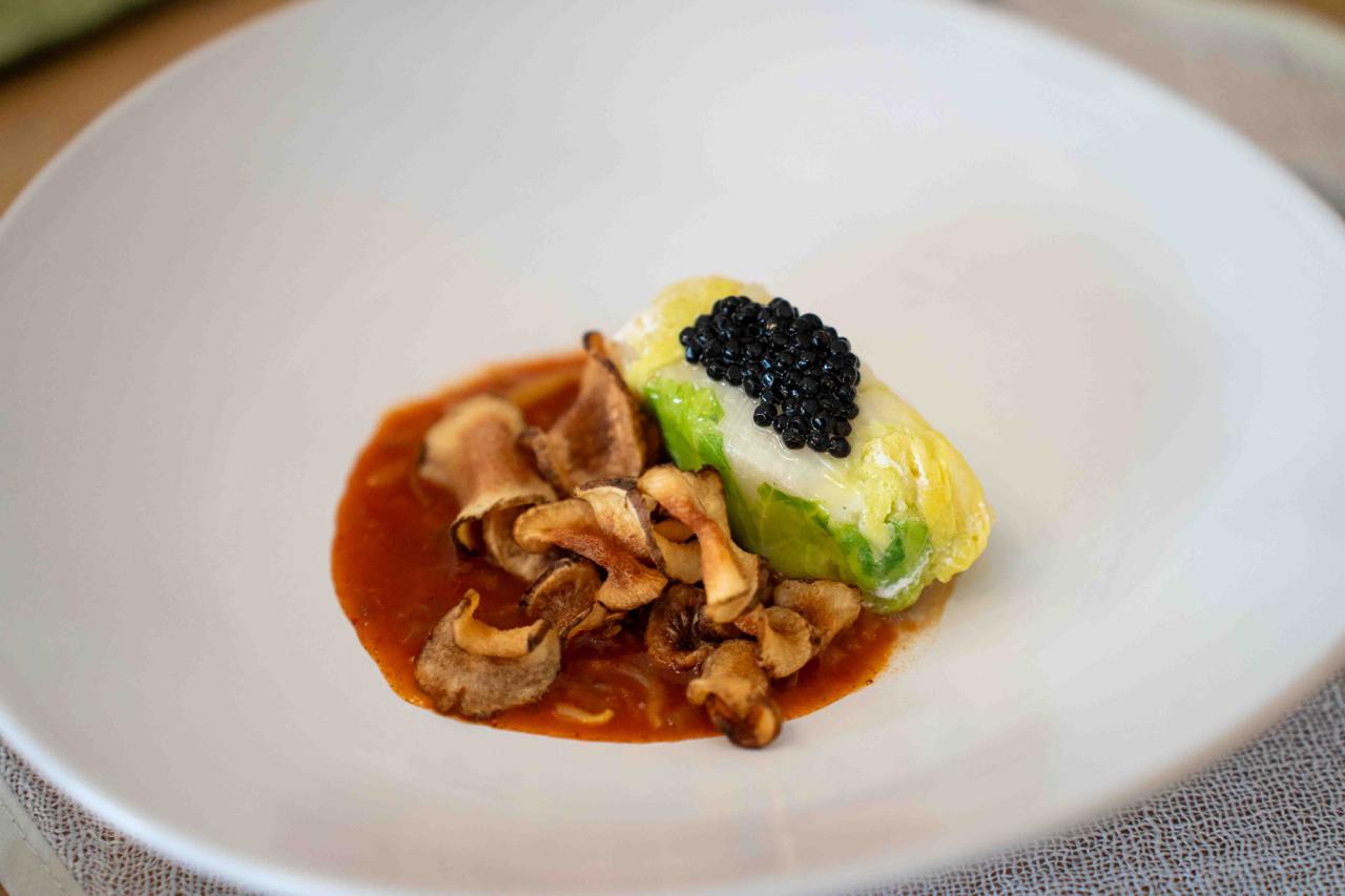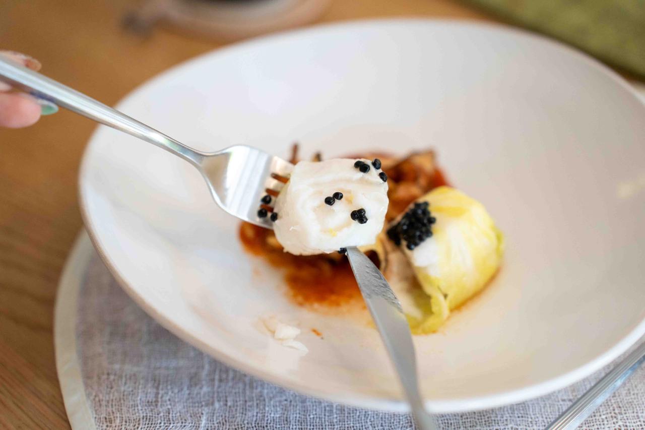 For seafood lovers who love sashimi, the Scallop Naengchae is something to look forward to, with sashimi-grade Hokkaido scallops that have been lightly torched for a hint of smokiness. The sweet and tender scallops were the perfect balance to the citrusy orange wedges and celery oil sauce. You’ve got to get a little of everything on the plate for the best bite. We’re familiar with cabbage-wrapped meat, so the cabbage-wrapped Fish Jjim dish was something pretty new to us, though a very welcome surprise. The fork-tender cod fish tasted light on its own, but paired with the traditional Korean spicy sauce and sunchoke chips—gave a whole new textural experience to the dish.