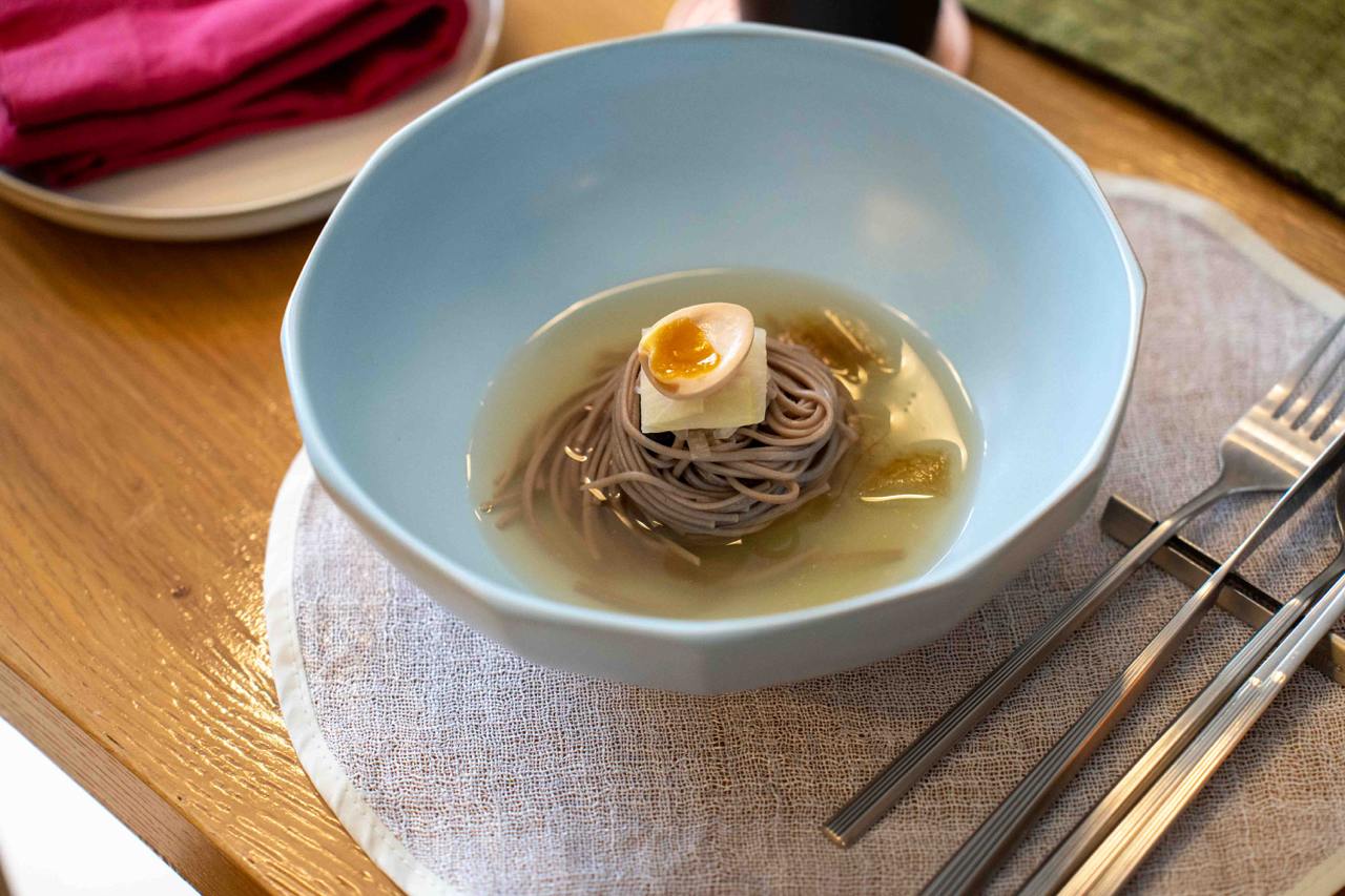 Following the “refreshing” Summer theme of the course comes the Dongchimi Naengmyeon, an incredibly complex dish that’s so much more than a simple bowl of cold noodles. You have ingredients like mushrooms, radish and floral garnishes literally “hidden” within the swirls of noodles to be slowly unraveled altogether as you mix them up. Even the broth is unique, chilled with leaf-shaped mulberry leaf tea ice cubes that’ll slowly melt and change the taste of the broth as you eat.