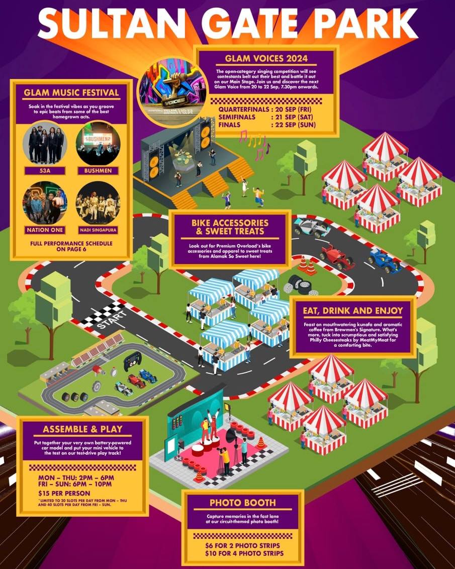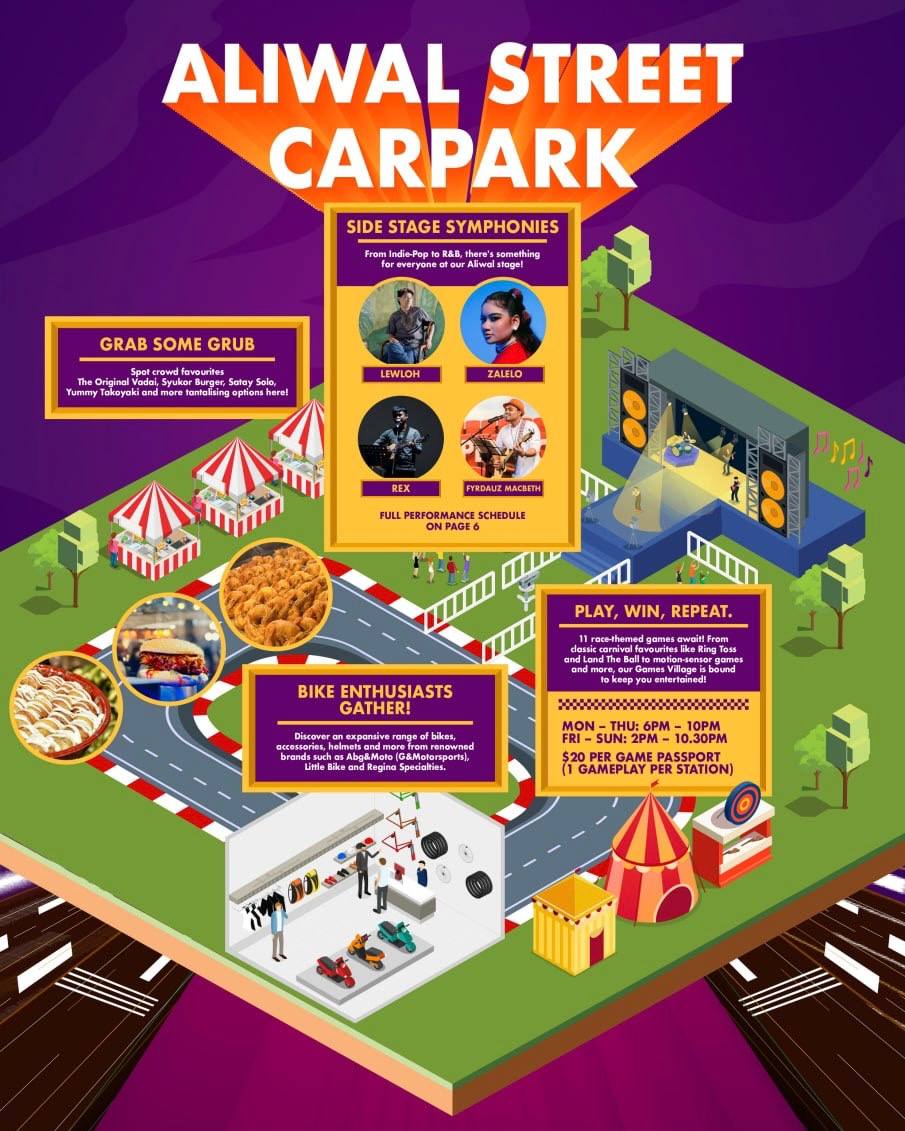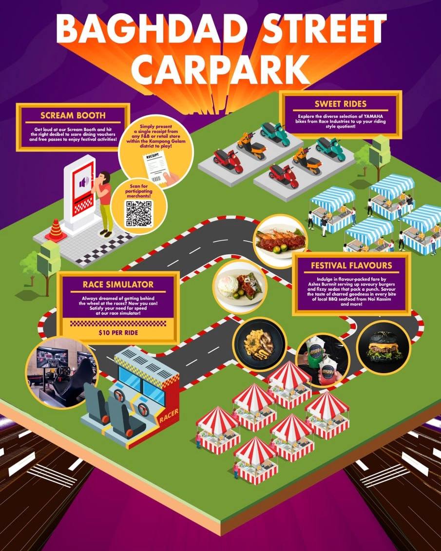 Foodies can look forward to viral street eats like rainbow cheese coin, burgers, beef birria tacos, deep fried sushi, loaded fries, Philly cheesesteaks, takoyaki, kebabs, roti john, vadai, fried chicken, BBQ seafood imported snacks and more. After feasting your way through the festival, enjoy other exciting activities like a circuit-themed photobooth, a games village with bowling, bullseye, ball toss and more, a scream booth to score free vouchers, plus live music and DJ acts.