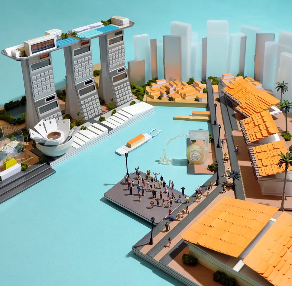 The exhibition showcases intricate dioramas of familiar landscapes like Marina Bay Sands, Gardens by the Bay restaurants, swimming pools and more; all using every items like desk supplies, staples, calculators, pencil cases, brushes and even cakes!