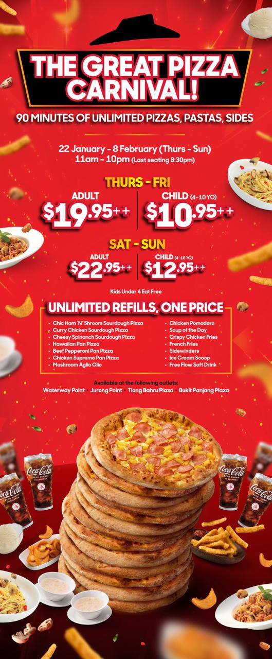 Pizza fans, you asked for it: Pizza Hut’s fan-favourite pizza buffet is finally making a comeback this 22nd January 2026, for a limited time only! The popular dine-in buffet, The Great Pizza Carnival, will be returning to selected outlets from $19.95++ per person.