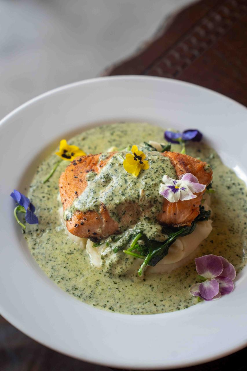 Crispy Salmon with Basil Pesto Cream, $28.90