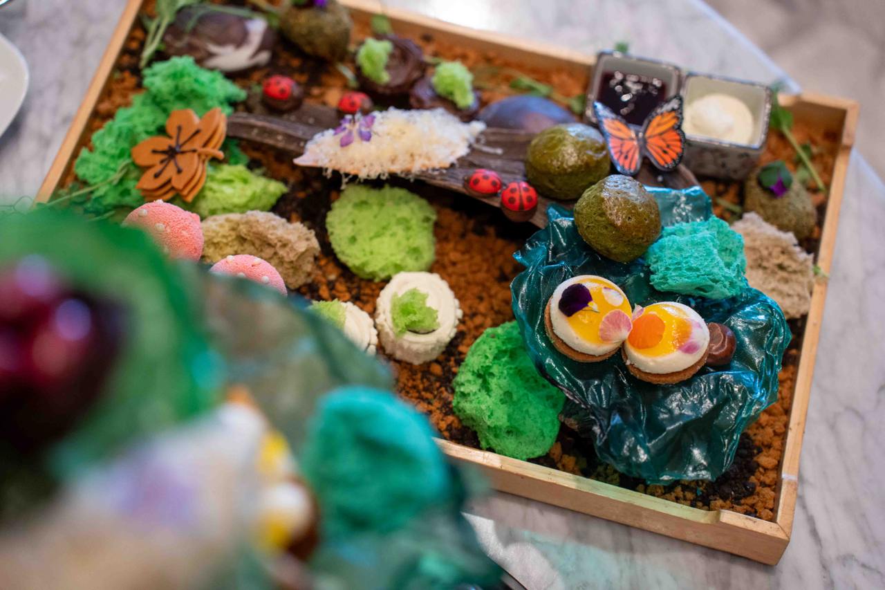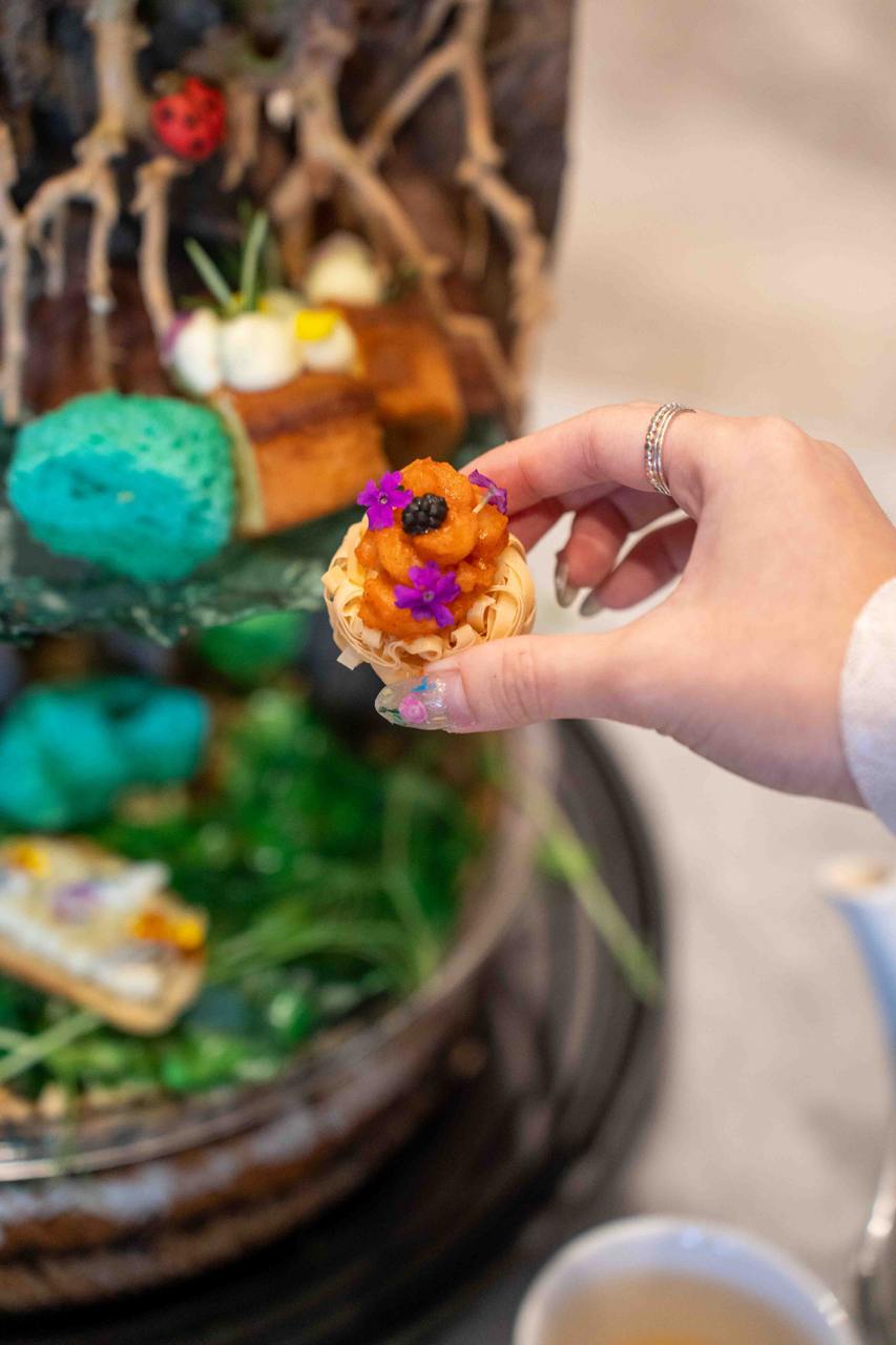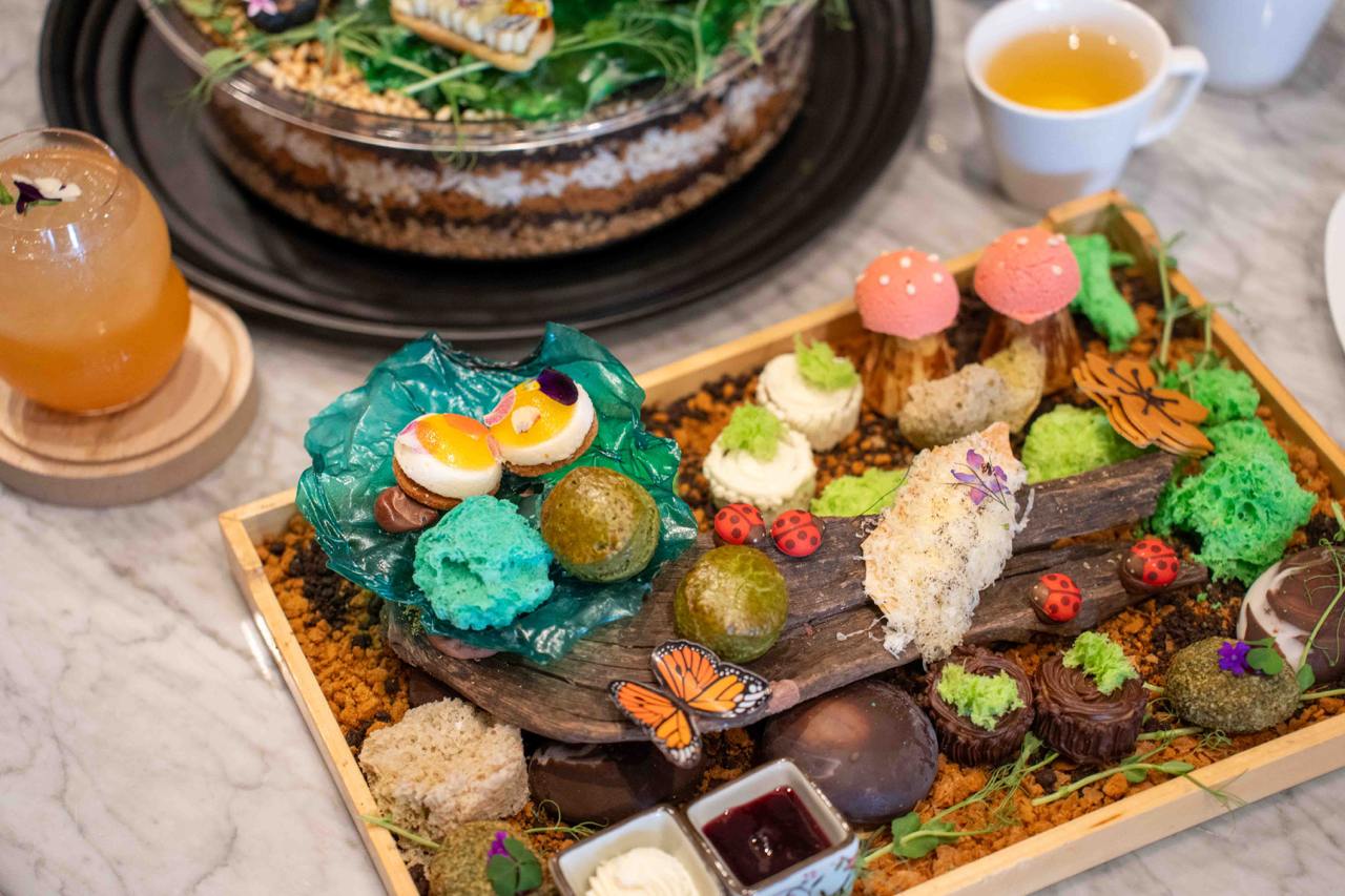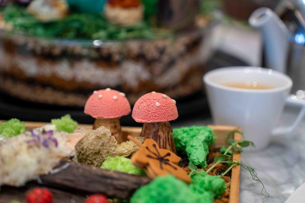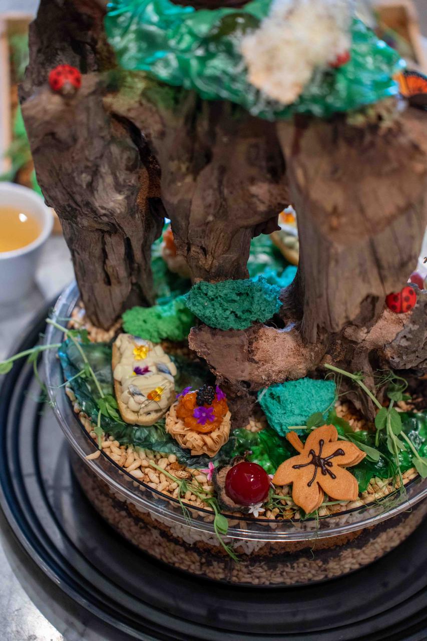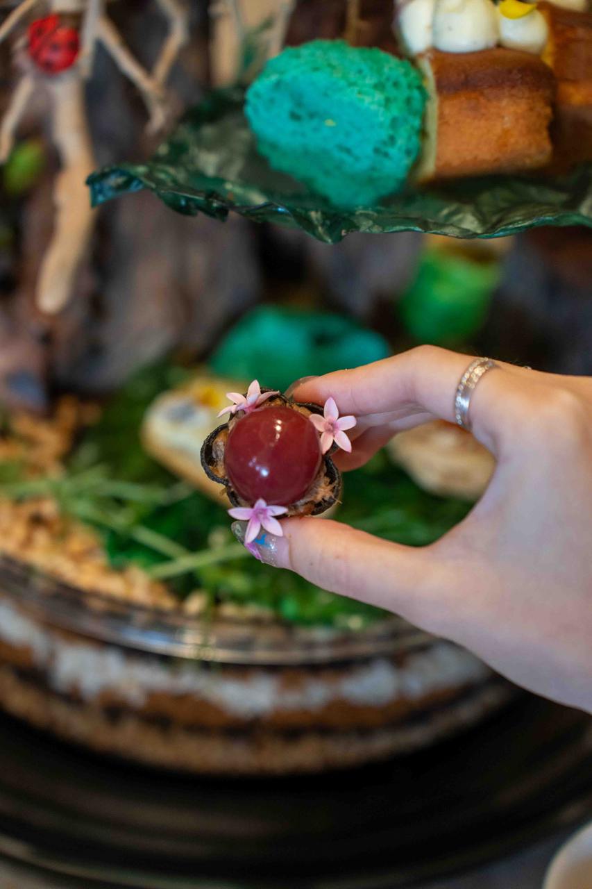 The sweets and savouries are also themed to fit the enchanting forest vibe: such as the mushroom-shaped Magical Toadstool, Spellbound Pebbles that resemble bird’s eggs in a nest, Comté Bark Chips with Fairy Dust made to look like tree bark sprinkled with freshly-shaved parmesan cheese as “fairy dust’, tarts that look like tree logs and other items topped with pretty edible flowers and herbs.