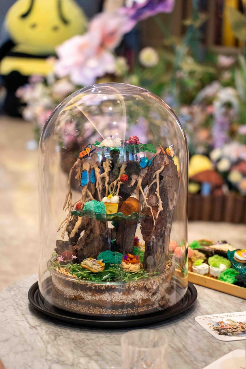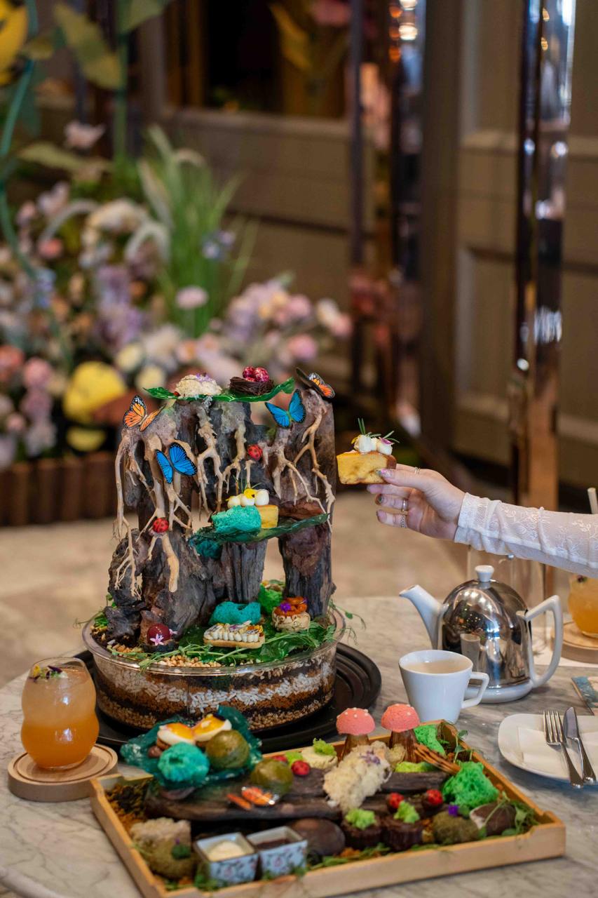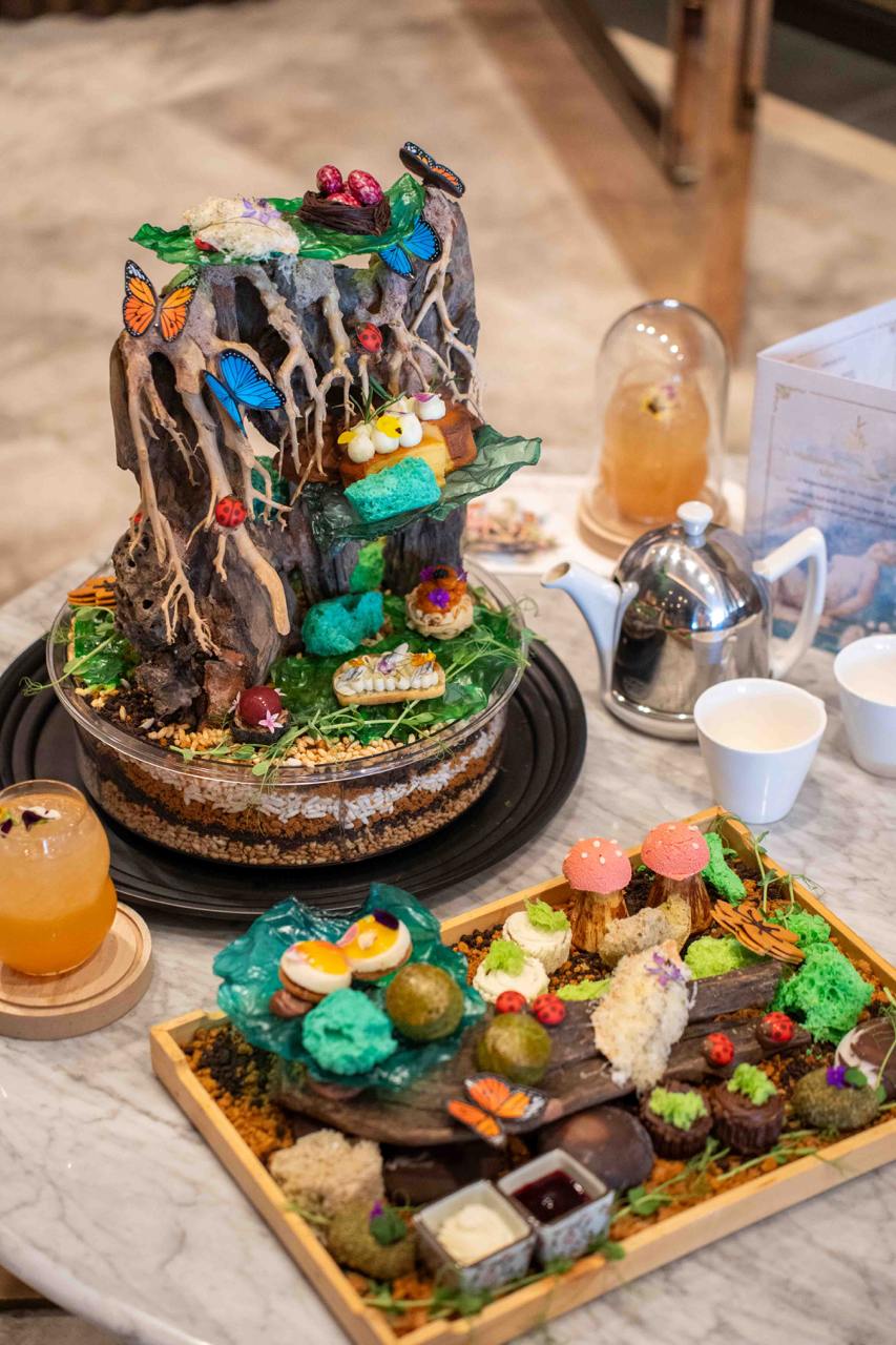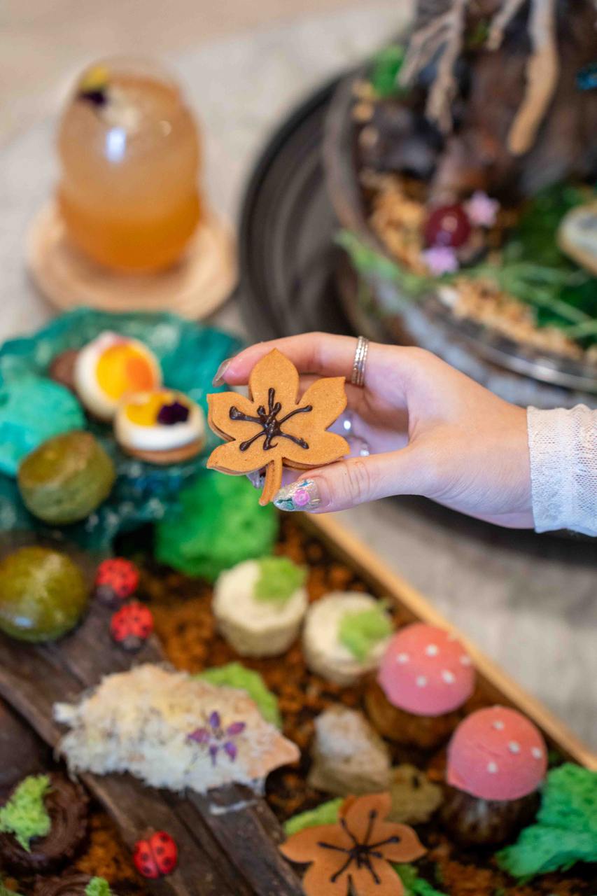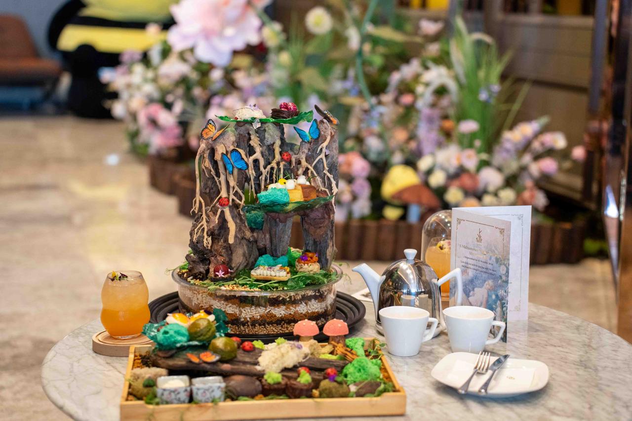The sweets and savouries are also themed to fit the enchanting forest vibe: such as the mushroom-shaped Magical Toadstool, Spellbound Pebbles that resemble bird’s eggs in a nest, Comté Bark Chips with Fairy Dust made to look like tree bark sprinkled with freshly-shaved parmesan cheese as “fairy dust’, tarts that look like tree logs and other items topped with pretty edible flowers and herbs.