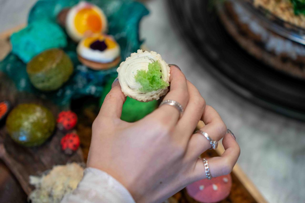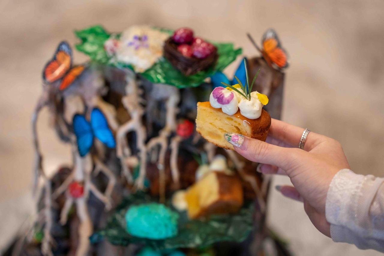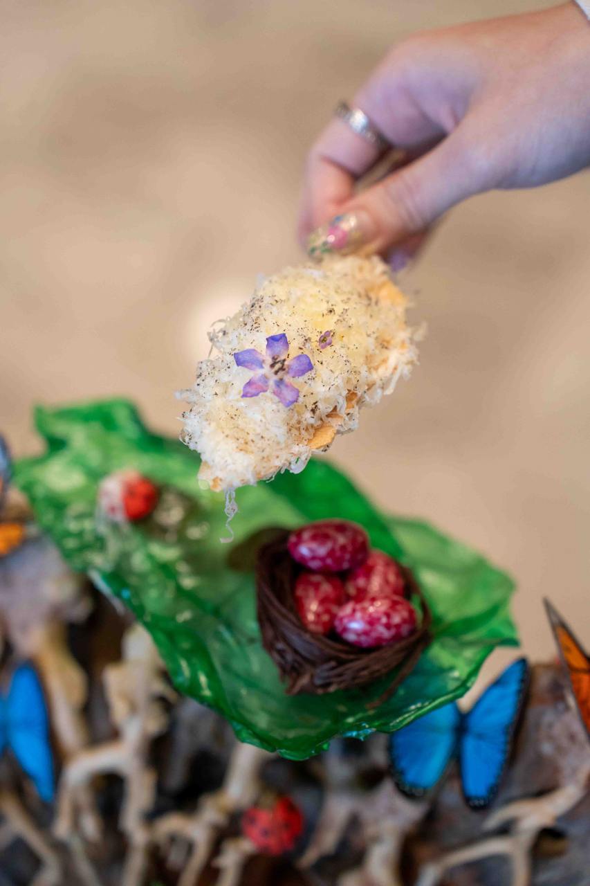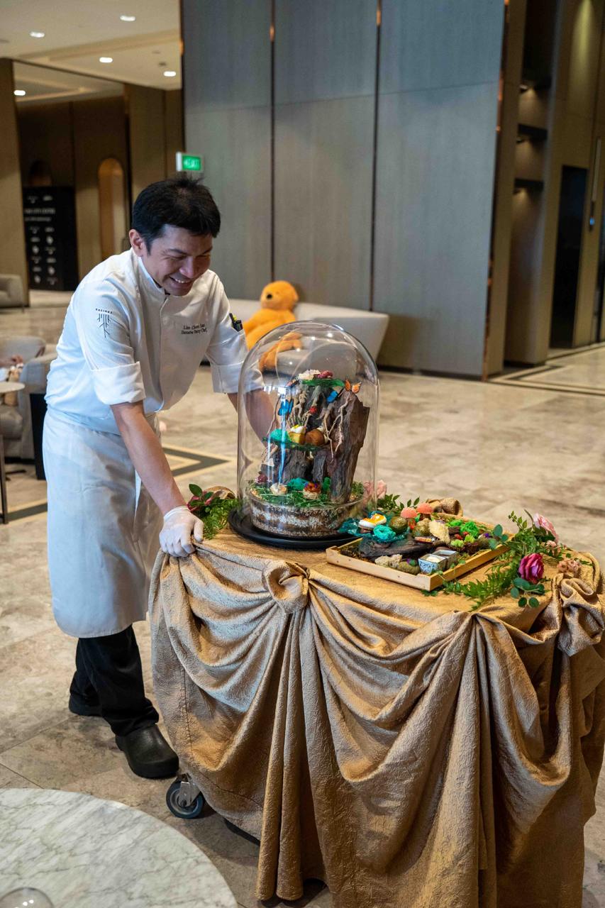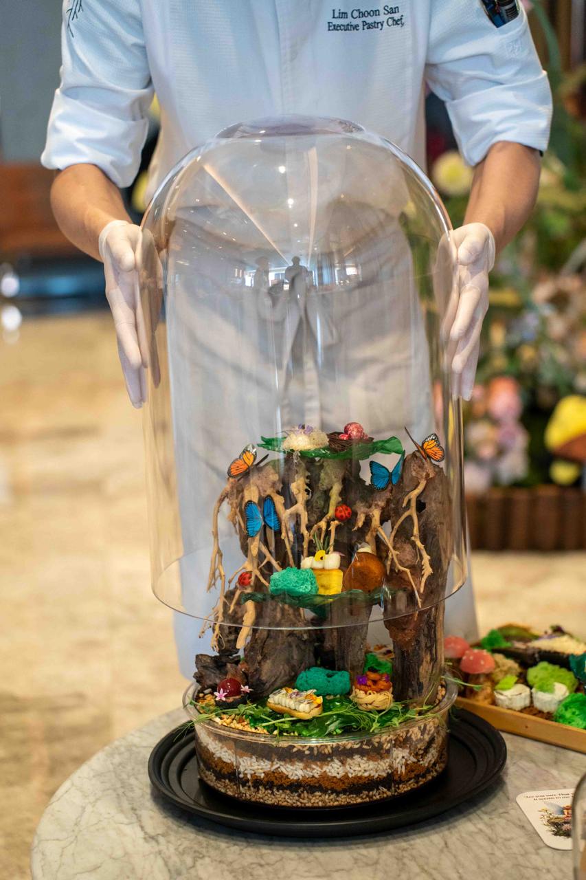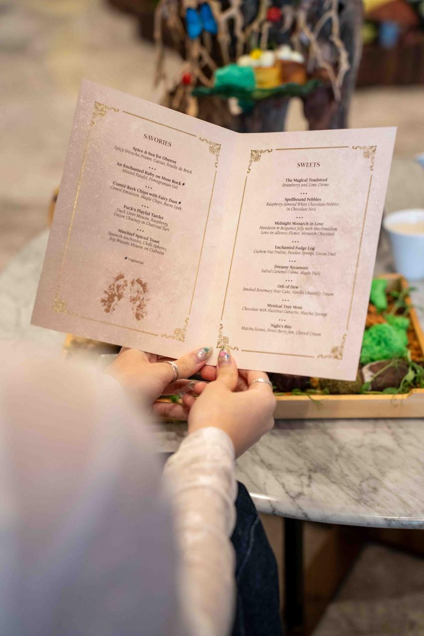 The sweets and savouries are also themed to fit the enchanting forest vibe: such as the mushroom-shaped Magical Toadstool, Spellbound Pebbles that resemble bird’s eggs in a nest, Comté Bark Chips with Fairy Dust made to look like tree bark sprinkled with freshly-shaved parmesan cheese as “fairy dust’, tarts that look like tree logs and other items topped with pretty edible flowers and herbs.