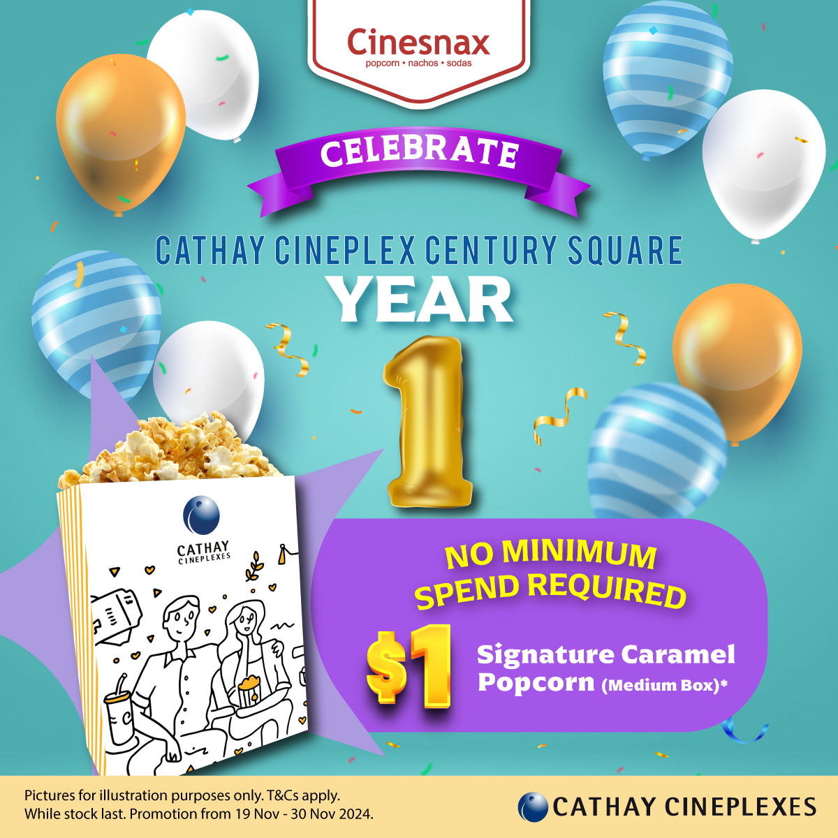 For a limited time only, Cathay Cineplexes’ Century Square outlet is offering their medium-sized Signature Caramel Popcorn Tub for just $1, with no minimum spending required at all! The $1 popcorn deal is in celebration of their Century Square outlet’s very first anniversary, and will be available from now till 30th November 2024 only.
