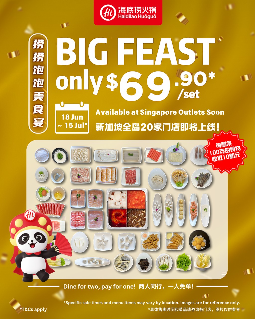 The buffet pricing excludes charges for the condiment bar and drinks. The Big Feast is available at all HDL outlets in Singapore from 18th June till 15th July 2024 on selected days as follows: