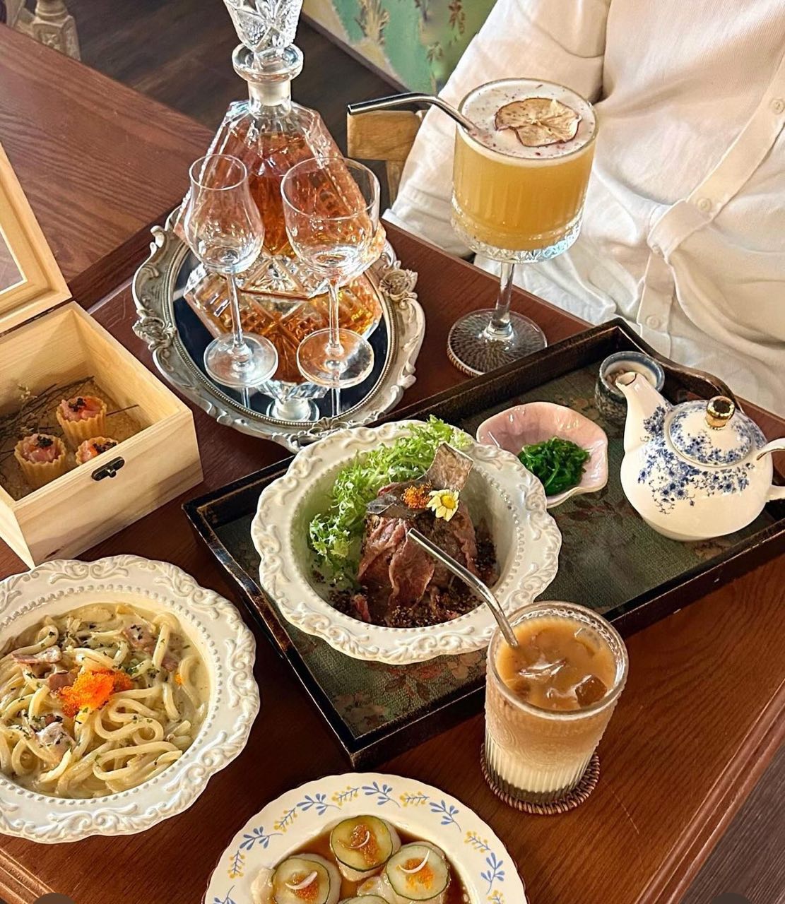 Aside from the gorgeous old-style touches, the café also serves their items in beautiful dishware: with mismatched serving plates, blue and white porcelain, wooden trays and even tea cocktails served in clear crystal bottles. On the menu are unique items like Aburi Truffle Beef Chazuke ($19.90), Applewood Smoked Negitoro Kueh Pie Tee ($18.90), Tsukune with Parmesan Crust ($9.80) and more.