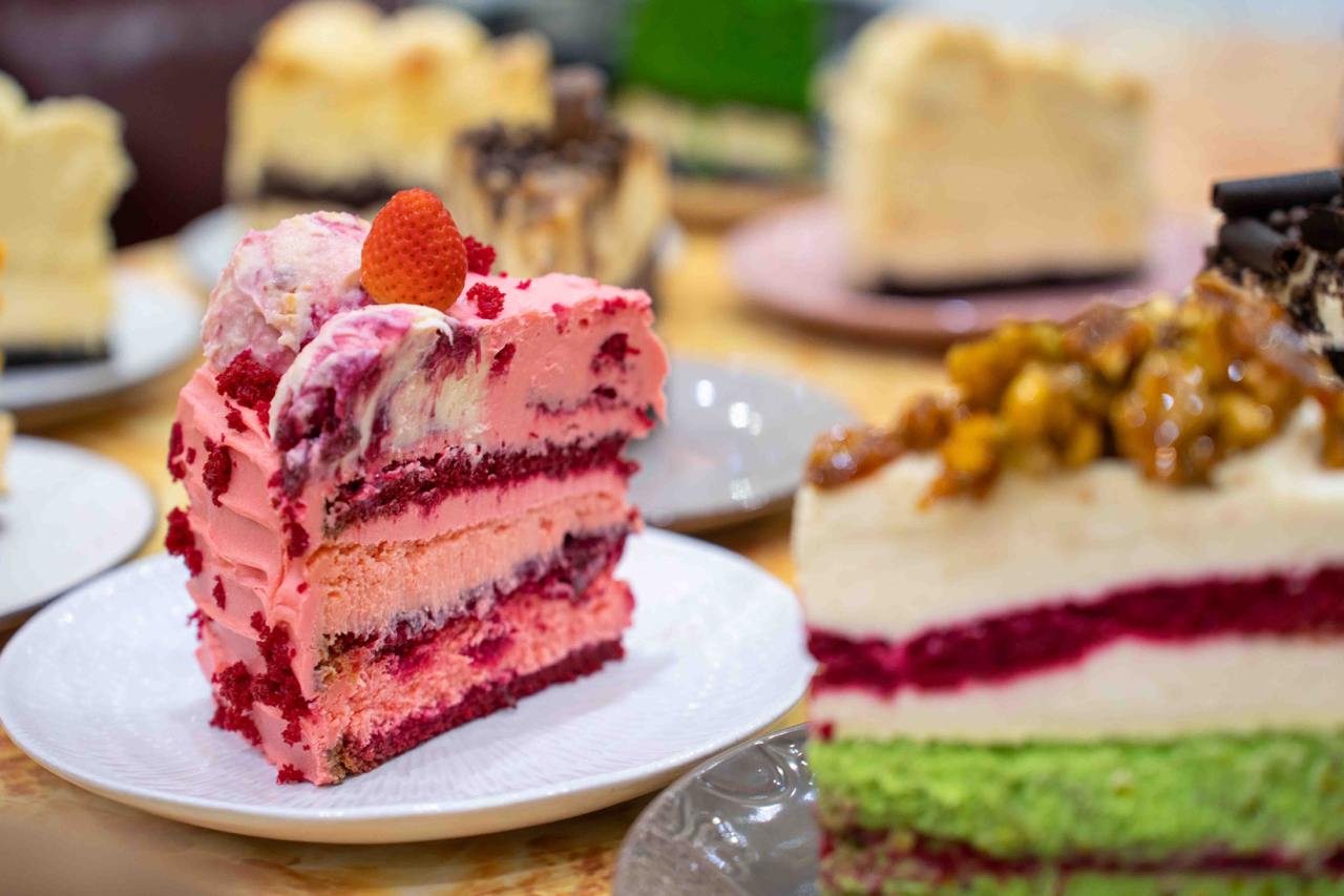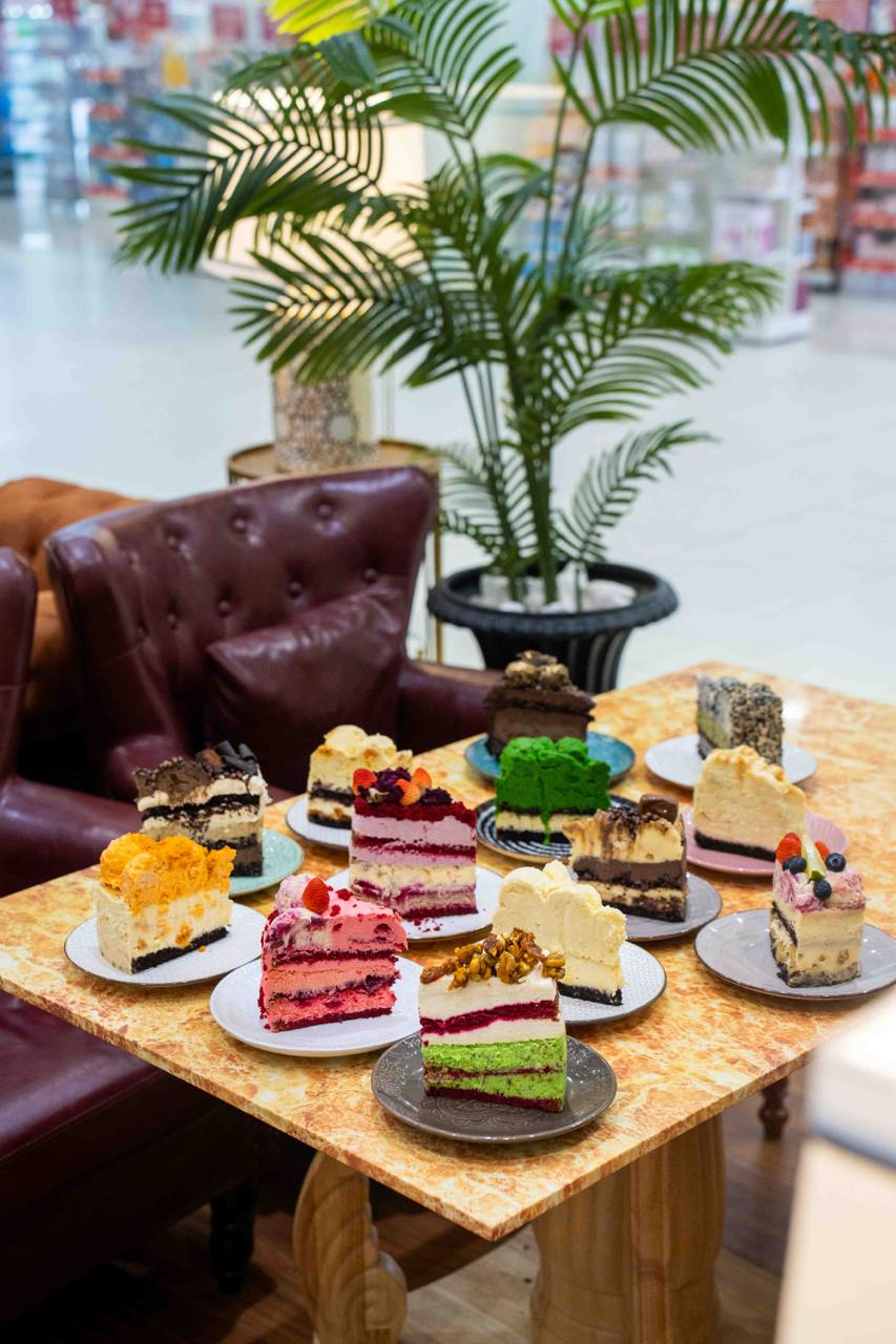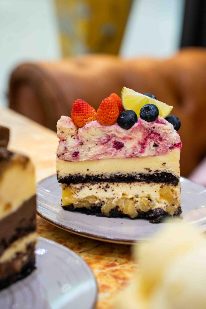 The cakes are colourful, chunky and mega-sized, each measuring at least 6 inches in height. Each slice is already super tall, and some of them are even topped with extra toppings like fresh fruits, cream and fillings; making them even bigger and nearly overflowing. The cakes are so thick that we couldn’t even cut through the whole cake with a fork at one go! Prices per slice start from RM36 (~$10 SGD) to RM78 (~$23 SGD), with most flavours ranging between RM40 to RM50. Some signature flavours you could try include the Musang King Deluxe, Berries Heaven or Unholy Hennessy.
