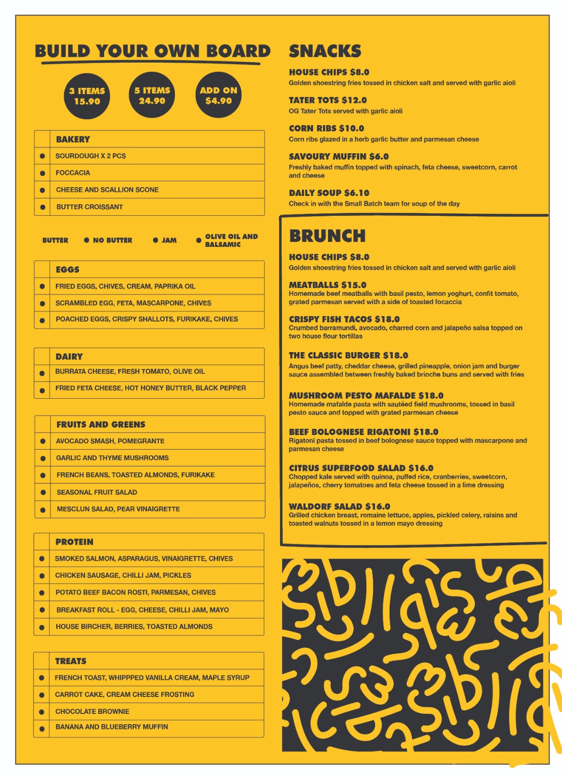 The highlight at Small Batch is definitely their Build-Your-Own Board menu, where you get to customise your own brunch board from a selection of over 20 different single-serve dishes. Take your pick from various proteins, eggs, fruits & greens, dairy, bakes, and sweets, and your brunch will come served on a wooden board; kind of like a cheese platter, but in brunch form.