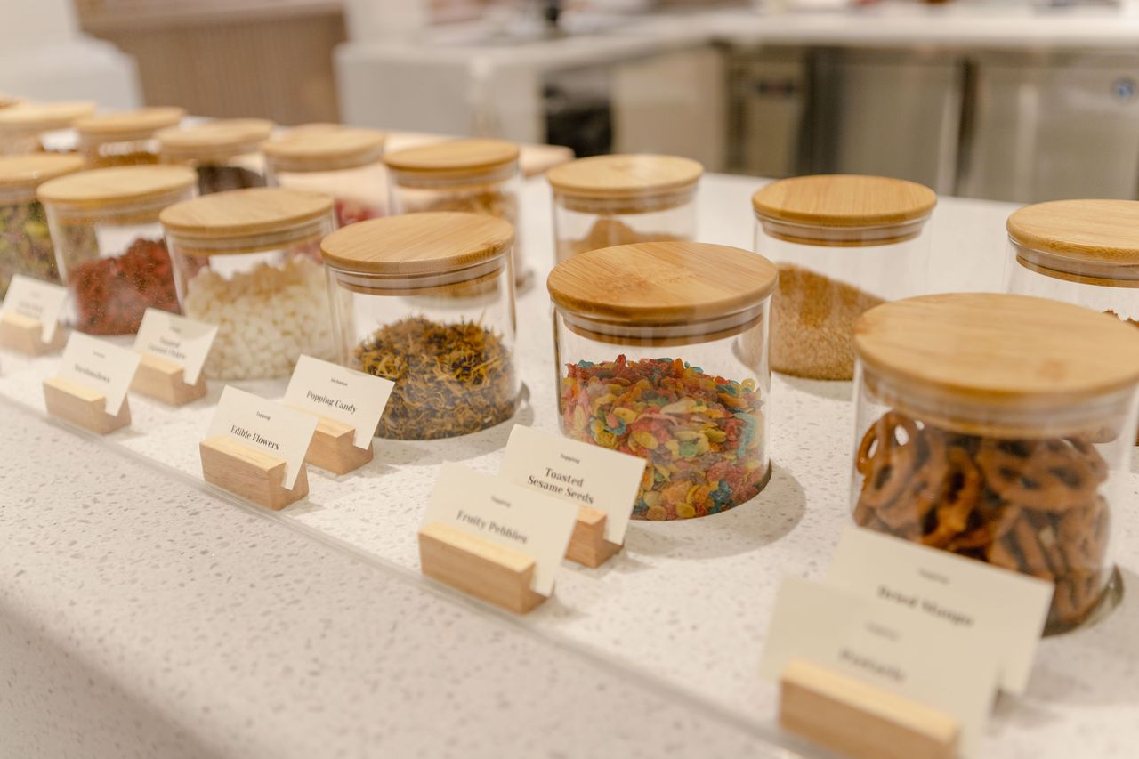 Add your fill of unlimited toppings from a selection of over 15 unique options. Some toppings options include Crushed Potato Chips, Popping Candy, Pretzels, Himalayan Salt Popcorn, Marshmallows, Mini Star Sprinkles, Edible Flowers, Sea Salt Flakes, Freeze-dried Strawberries, Edible Flowers, Puffed Rice and more.