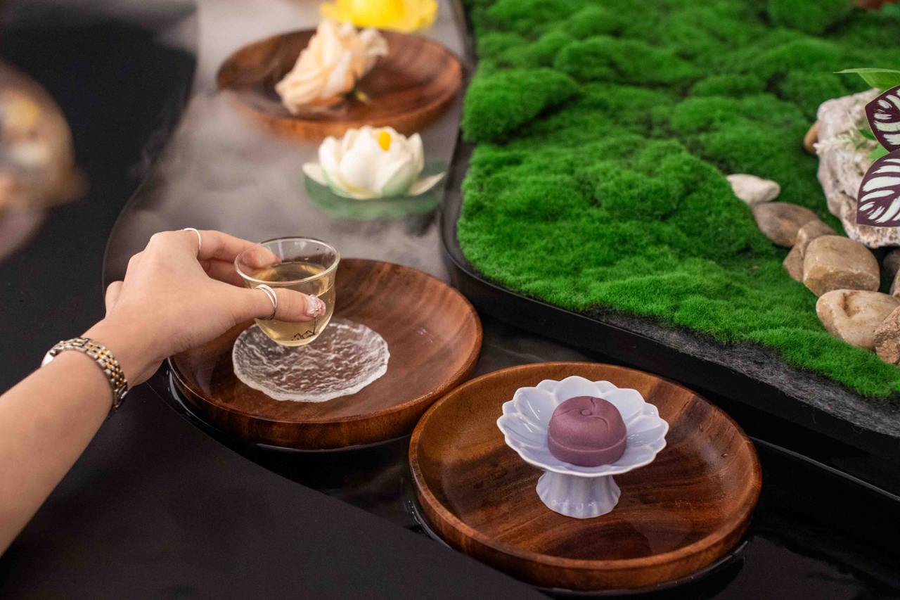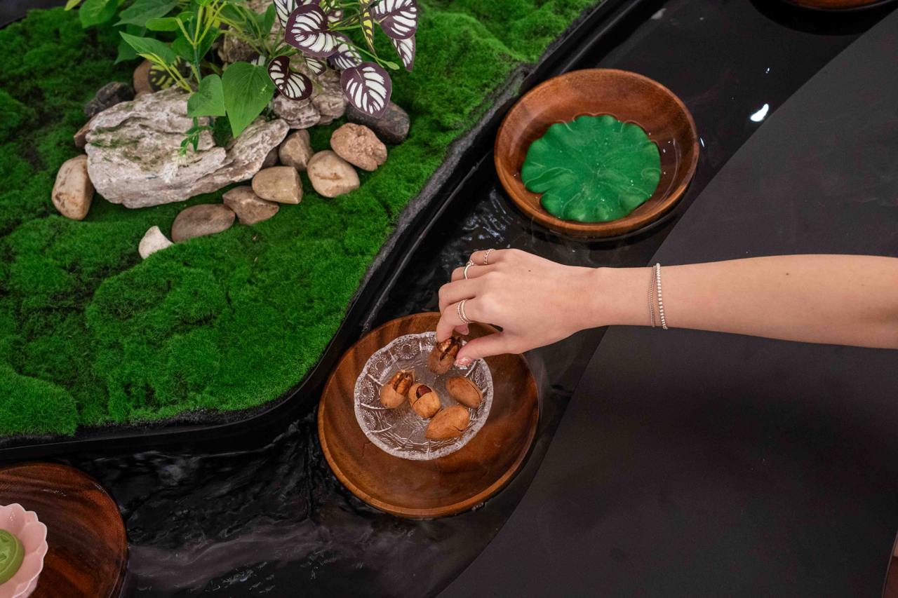 Aside from faux flowers floating in the water, there’s also wooden plates where you can place your tea cups, pastries and snacks, and float them across the stream—perfect for if you want to share your treats with someone else on the table, maybe? Just be careful to place the items right in the middle of the plate, and make sure it’s not too heavy, or else it’ll sink down into the water.