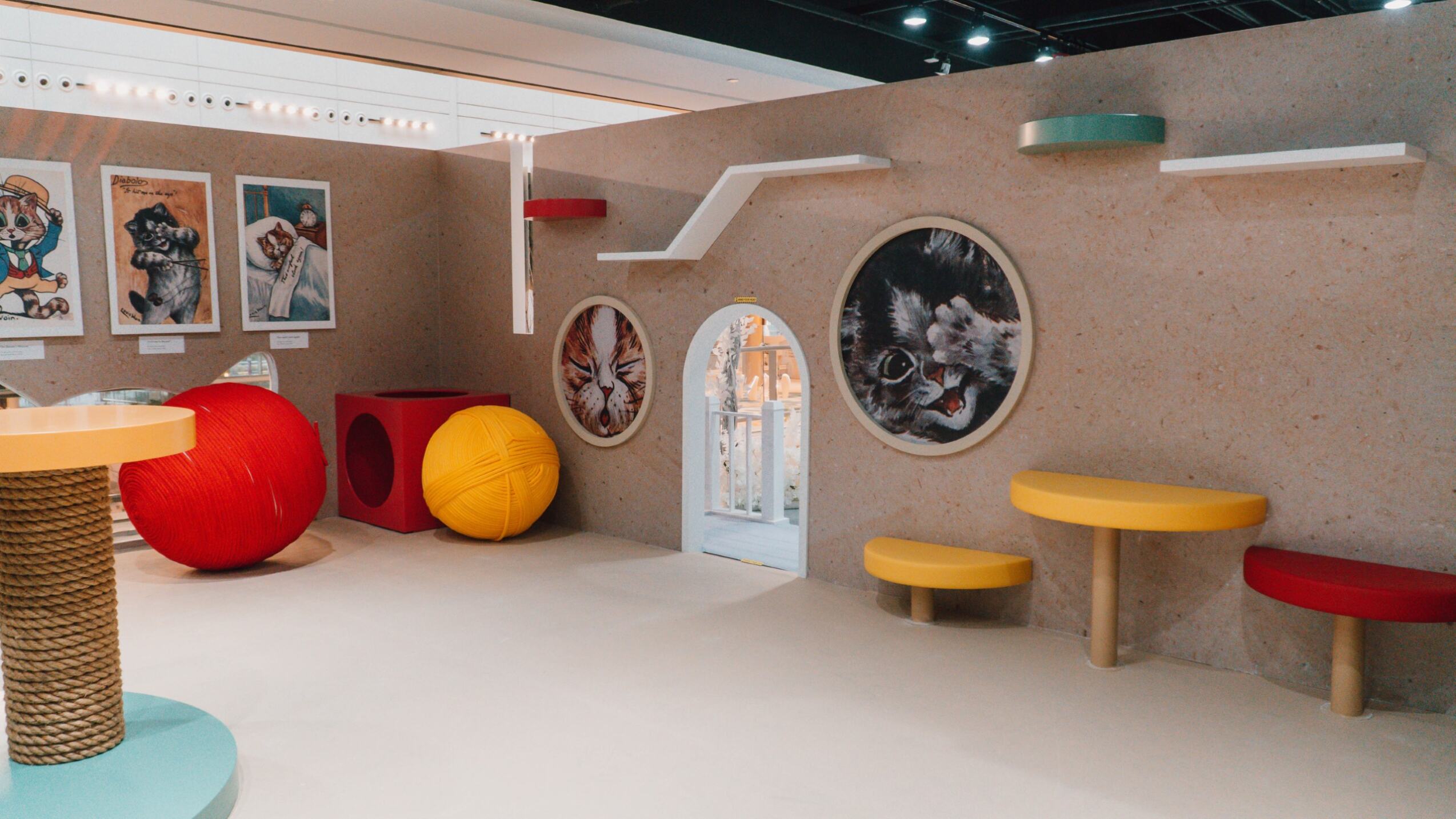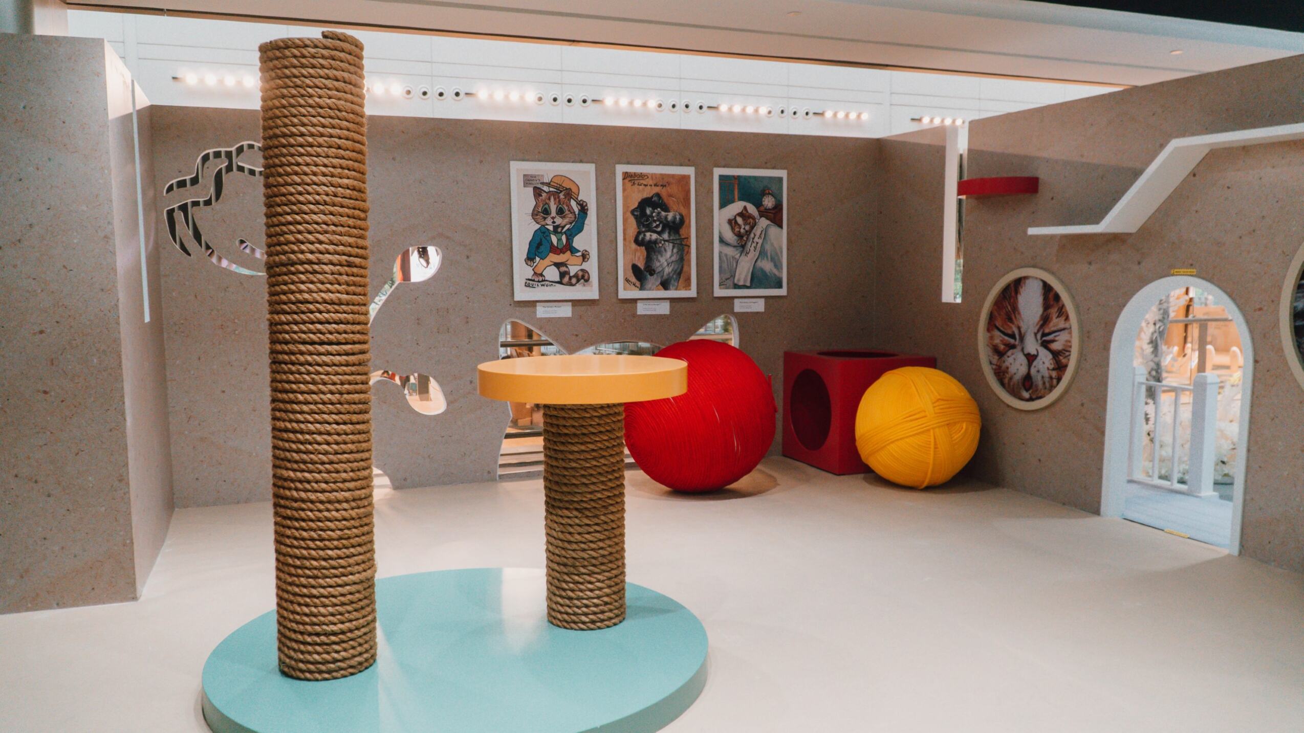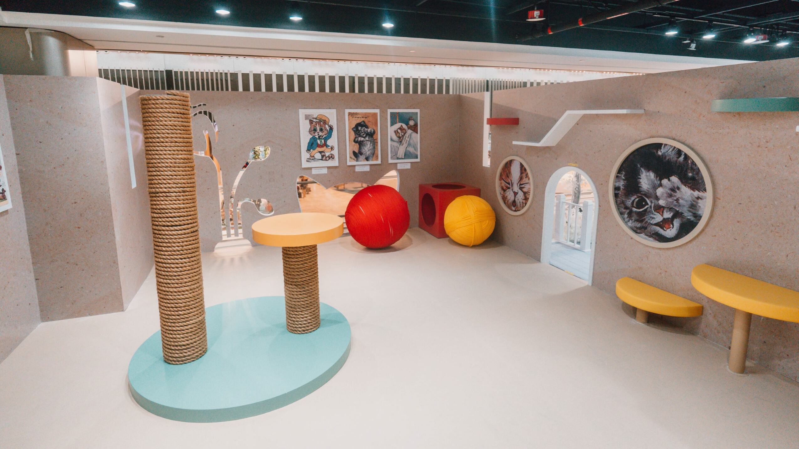 The Play Cottage actually looks like a real cat playground (like what you’ll see in cat cafés or in cat owners’ homes), with giant cat “climbing towers” and wall fixtures. There are even mega balls of “yarn” that you can roll and move around the playhouse.