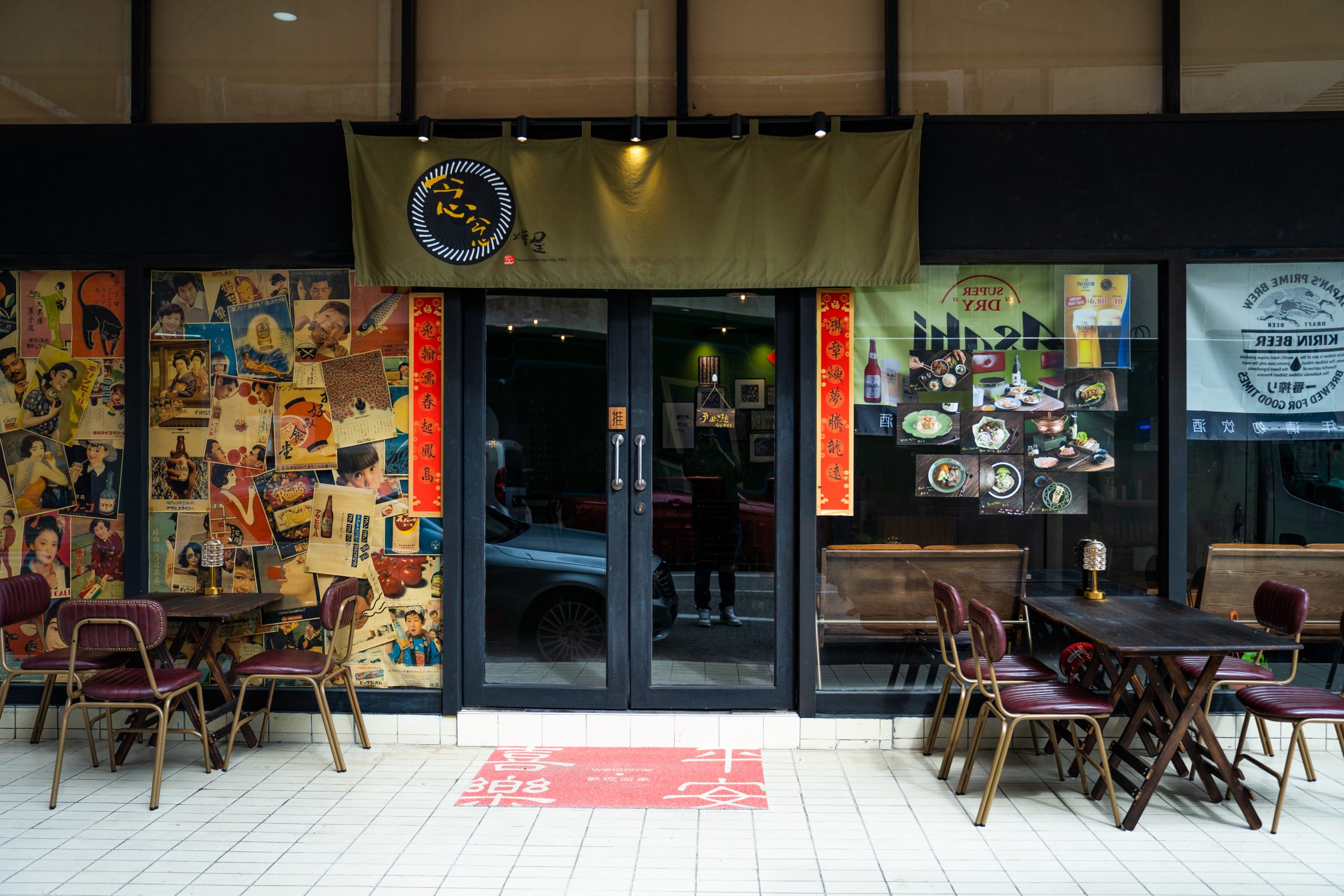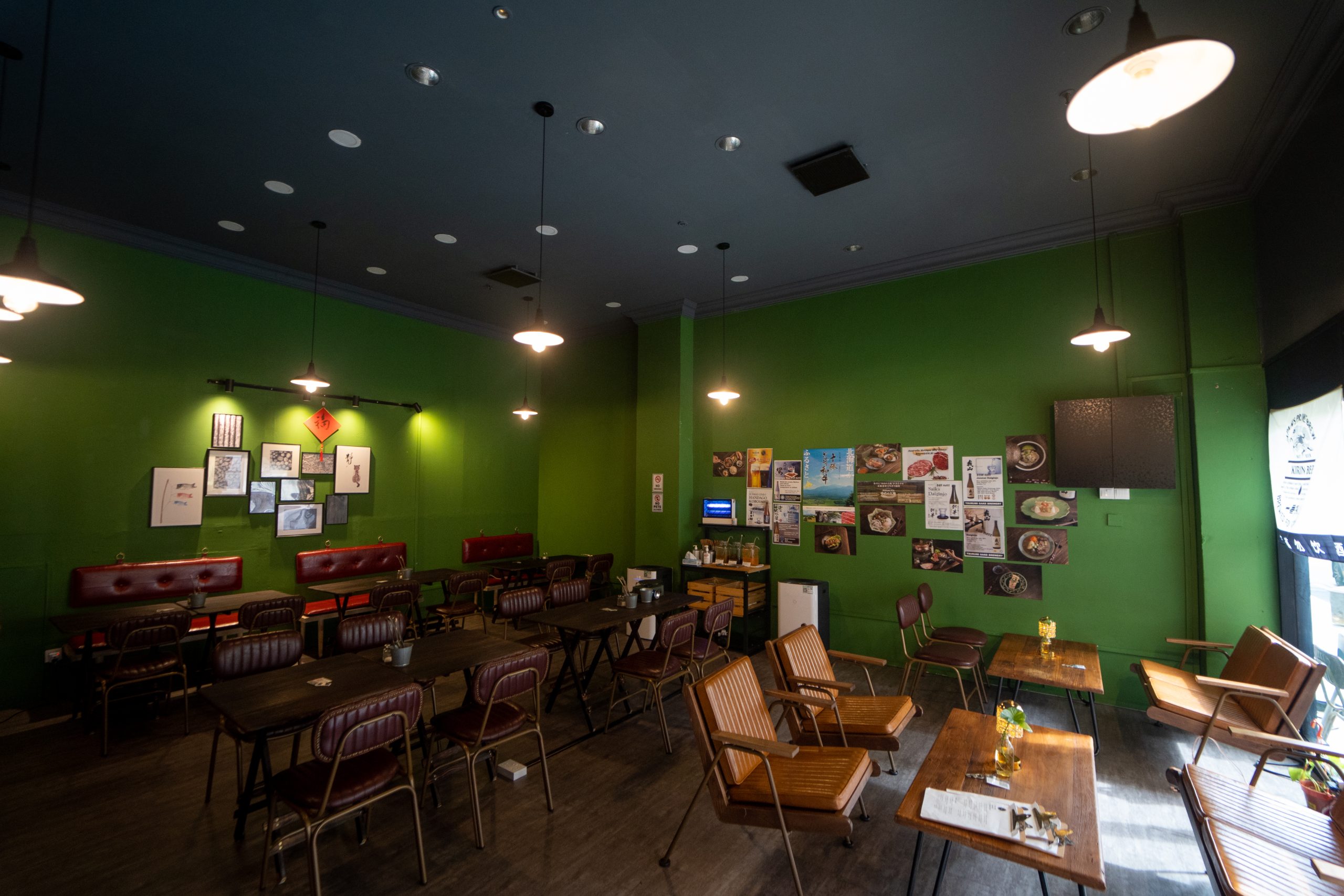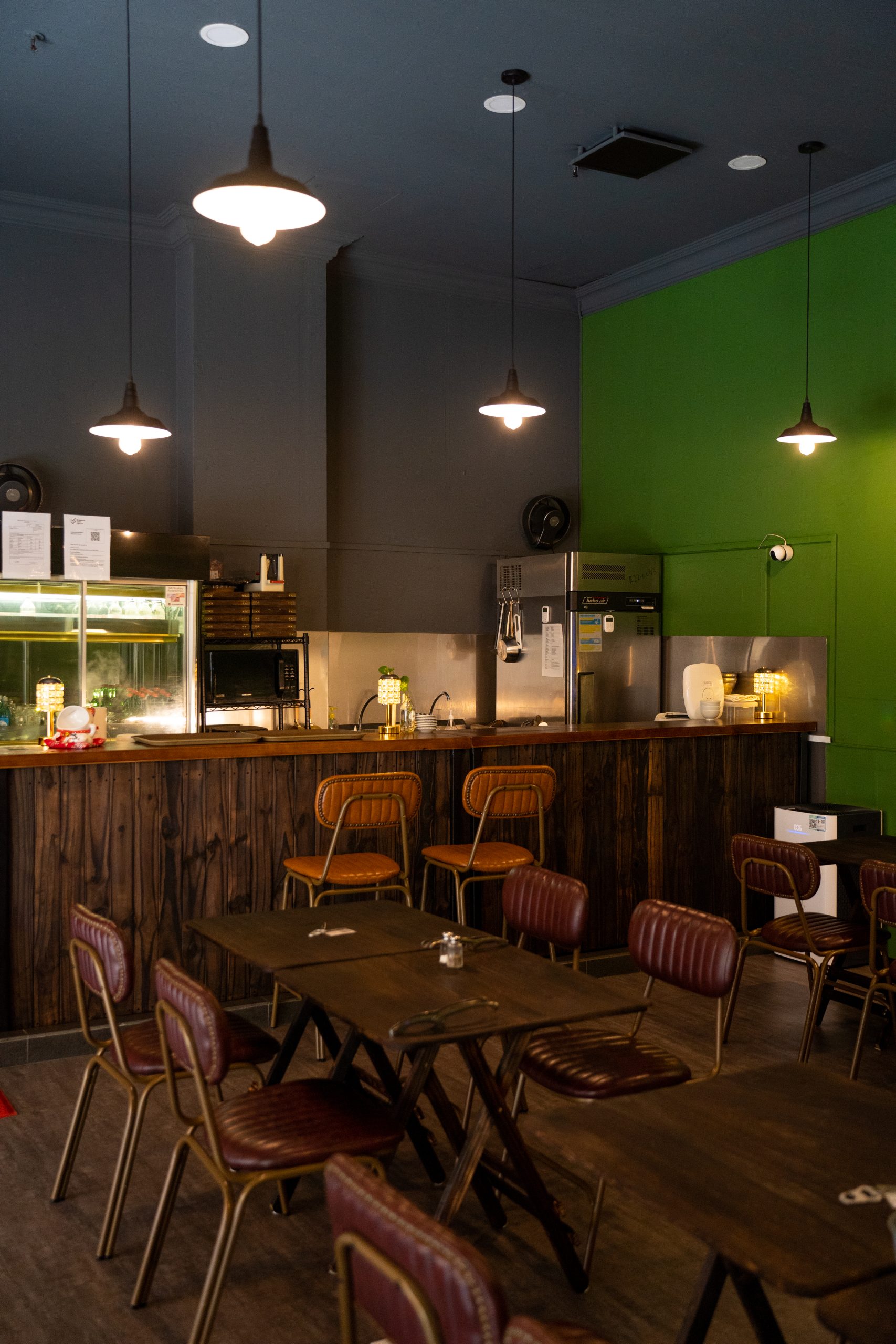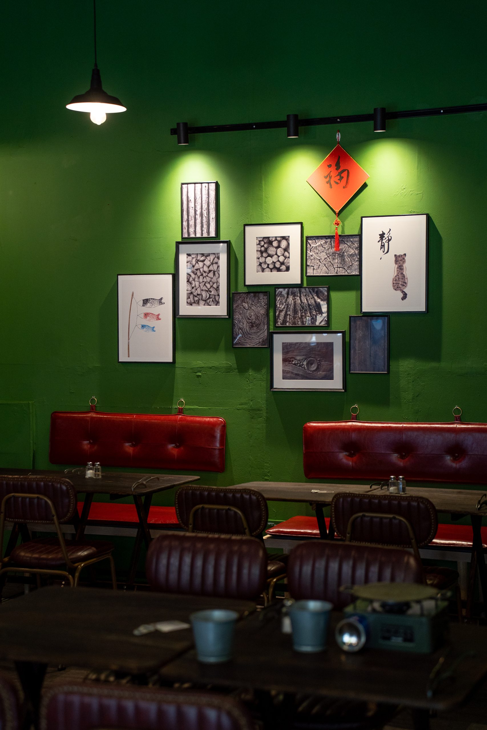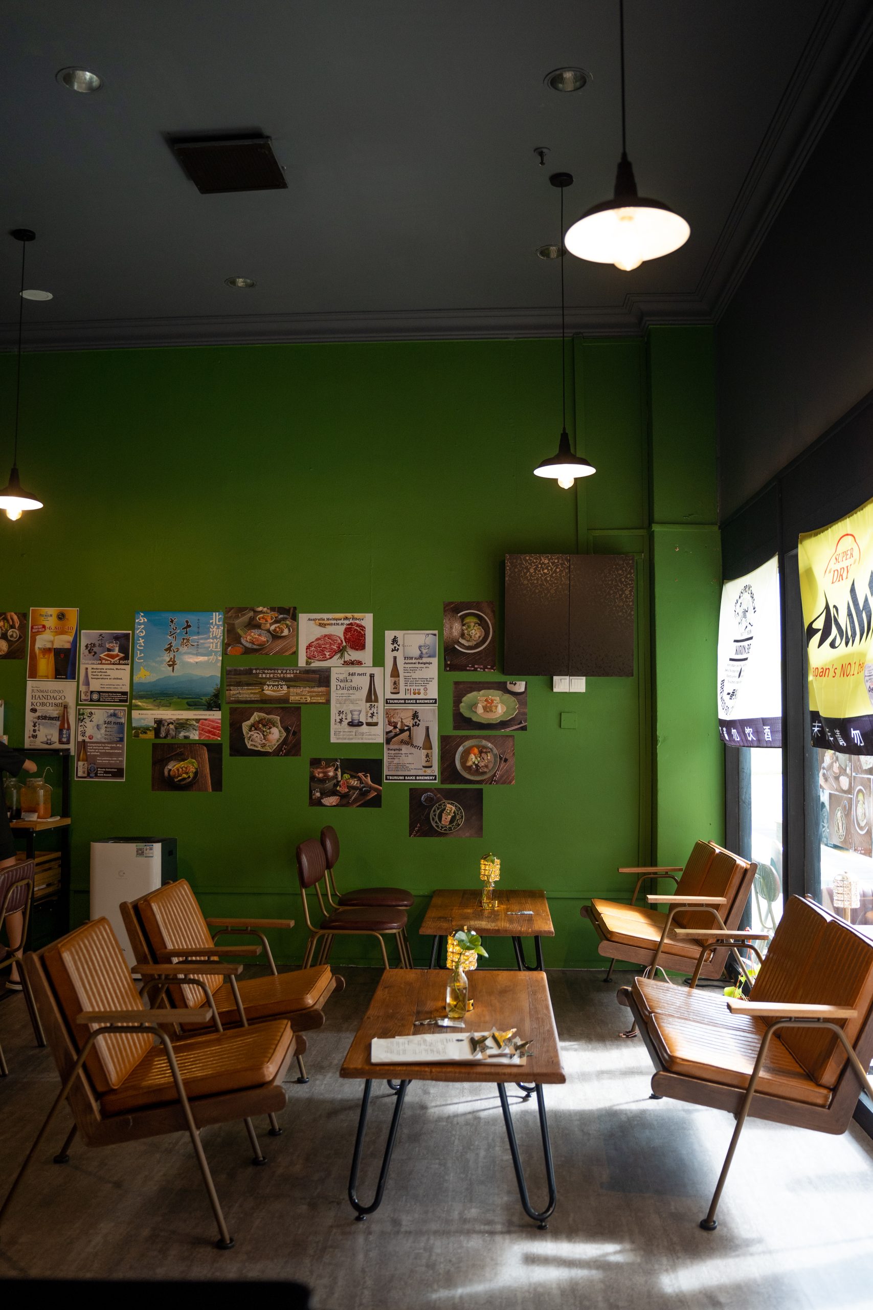 The restaurant itself boasts a nostalgic vintage-inspired ambience, with rich brown leather chairs, moody lighting, and hues of red and green. You’ll also find various posters depicting their menu and drink items, as well as artworks and calligraphy works decorating the walls. There are also vintage graphics and print-outs plastered all over the glass door—reminiscent of the decor style of old-school Japanese izakayas.
