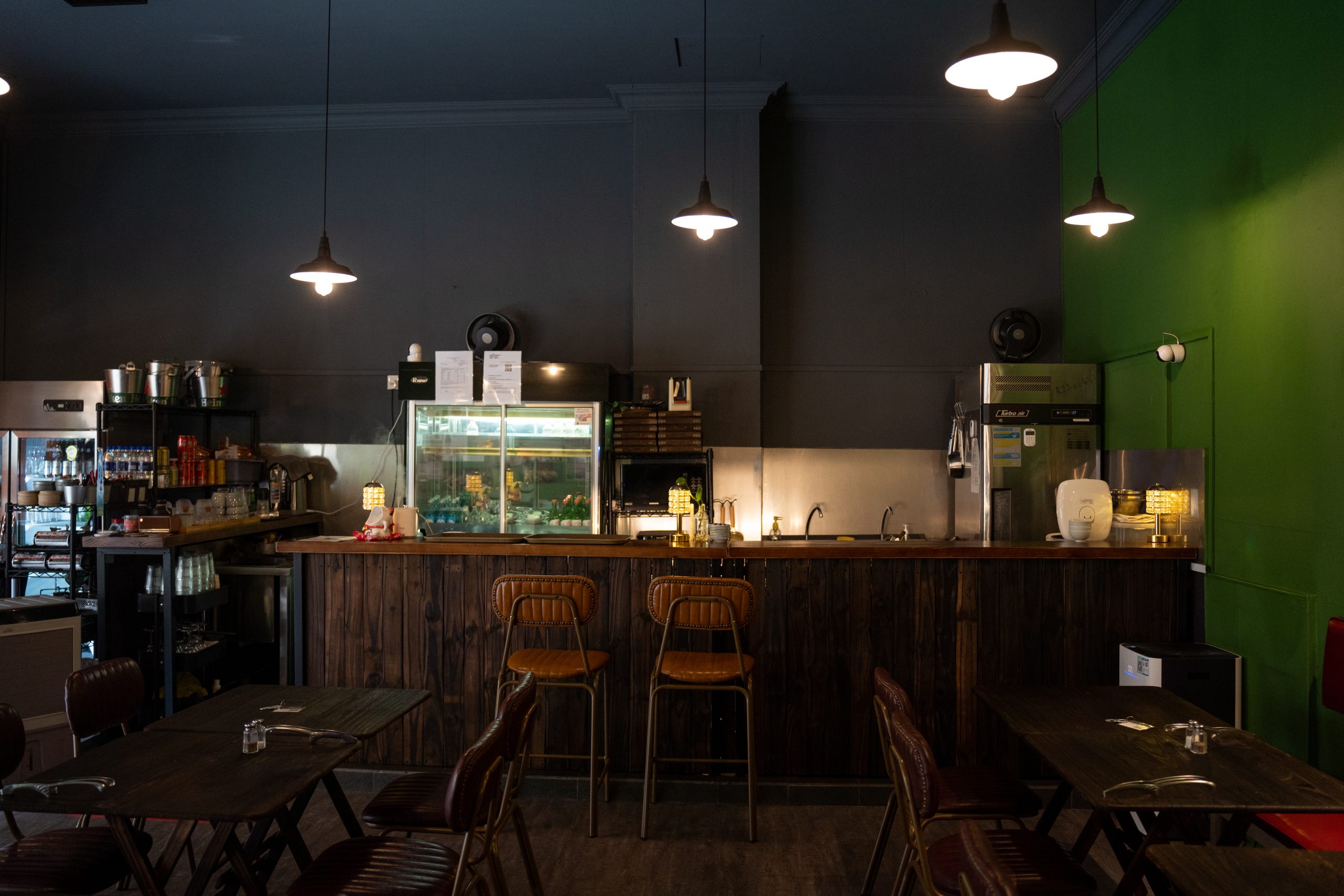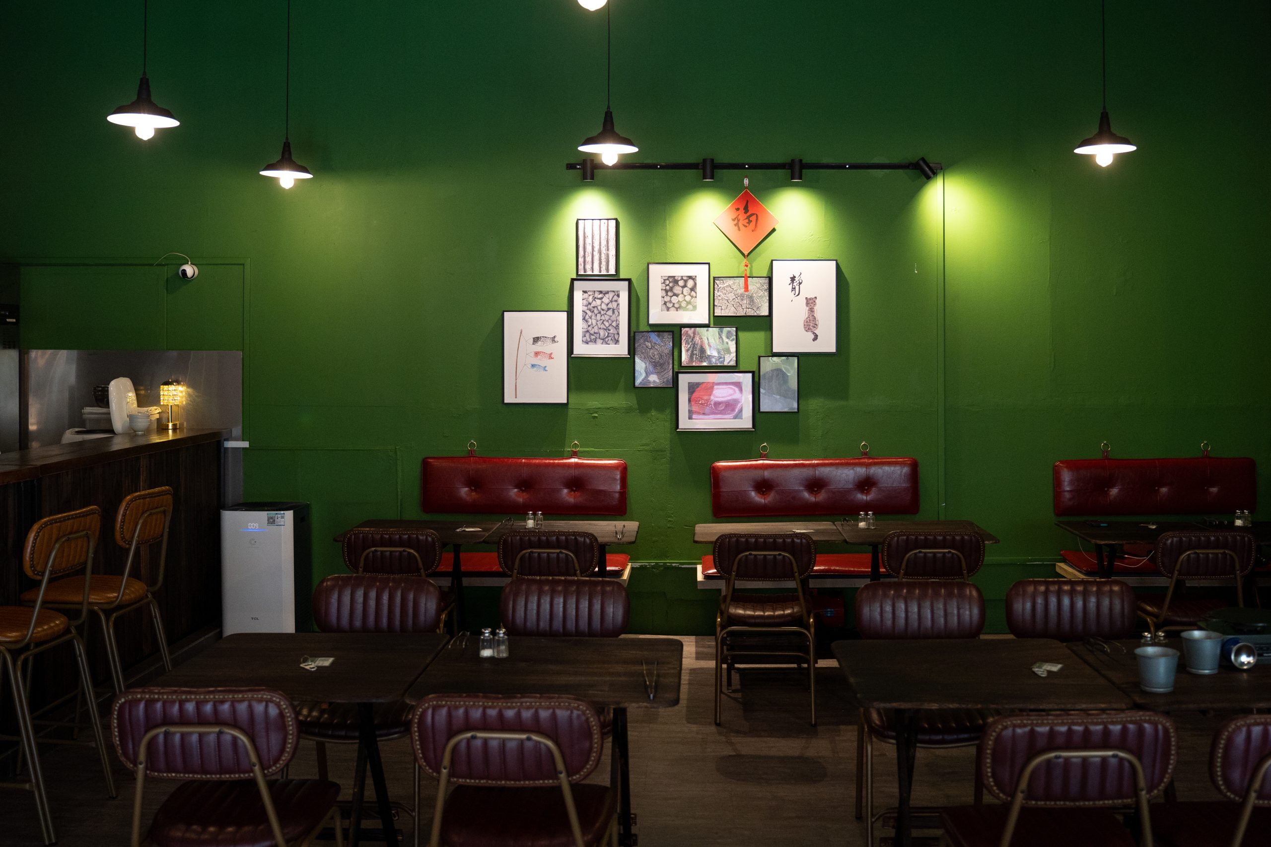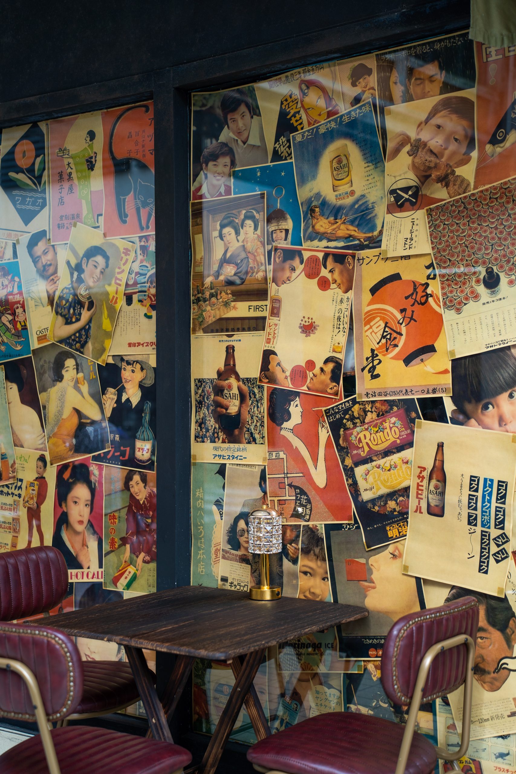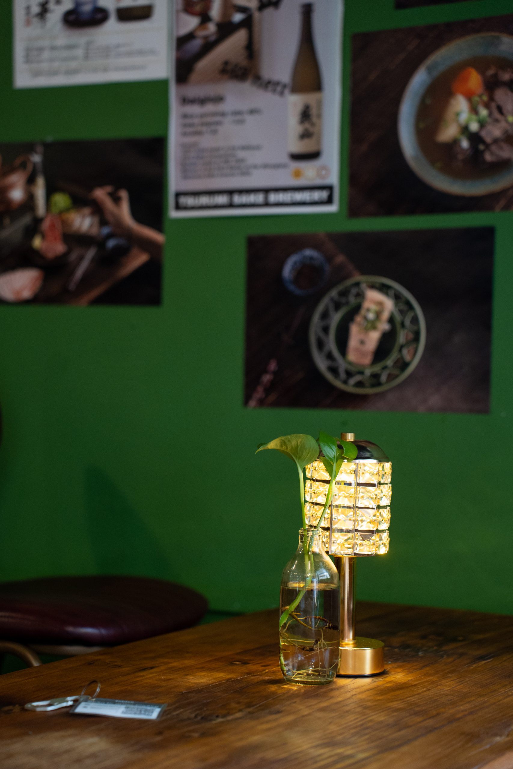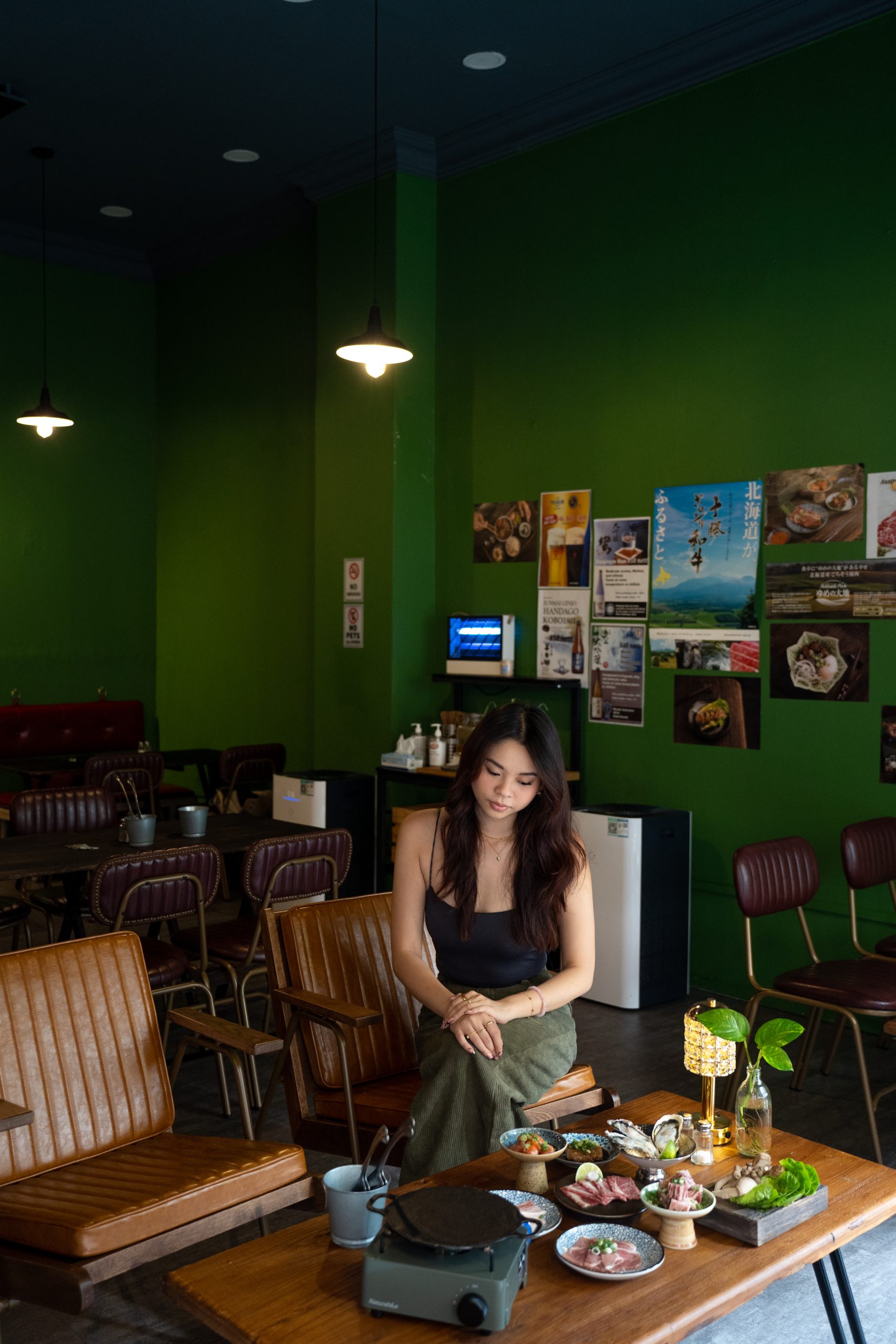 The restaurant itself boasts a nostalgic vintage-inspired ambience, with rich brown leather chairs, moody lighting, and hues of red and green. You’ll also find various posters depicting their menu and drink items, as well as artworks and calligraphy works decorating the walls. There are also vintage graphics and print-outs plastered all over the glass door—reminiscent of the decor style of old-school Japanese izakayas.