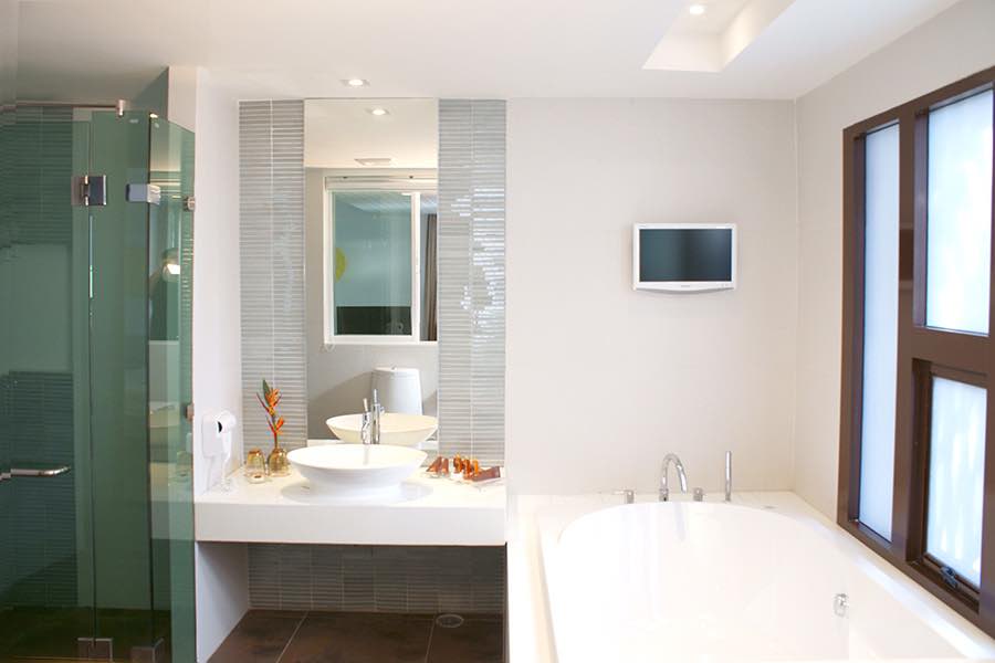 Each room is fitted with a living area, bedroom, bathroom with a dressing area and bathtub and even a balcony with 2 sunbathing chairs.