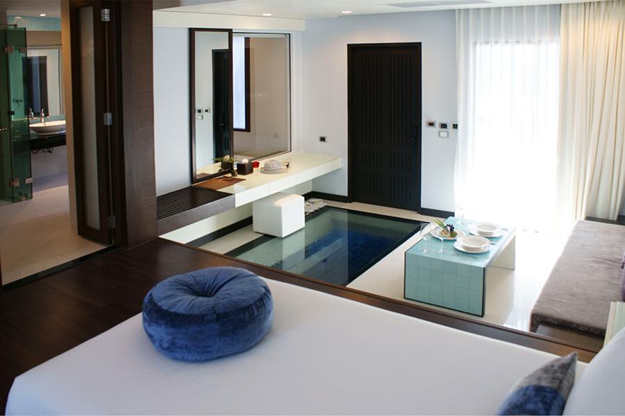 Guests can choose from two types of luxurious rooms, overwater villa and the pool view rooms. The overwater villa is directly above the swimming pool with pool access and view of the water beneath the glass flooring whereas the pool view room, located on the second floor, offers scenic views of the pool and a tropical garden for more privacy.