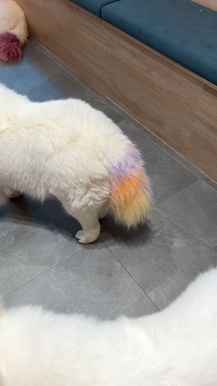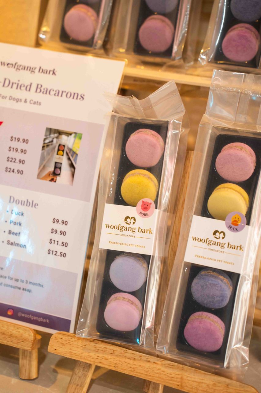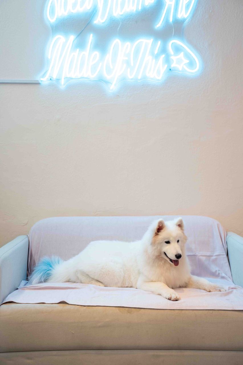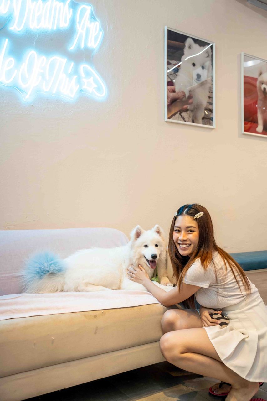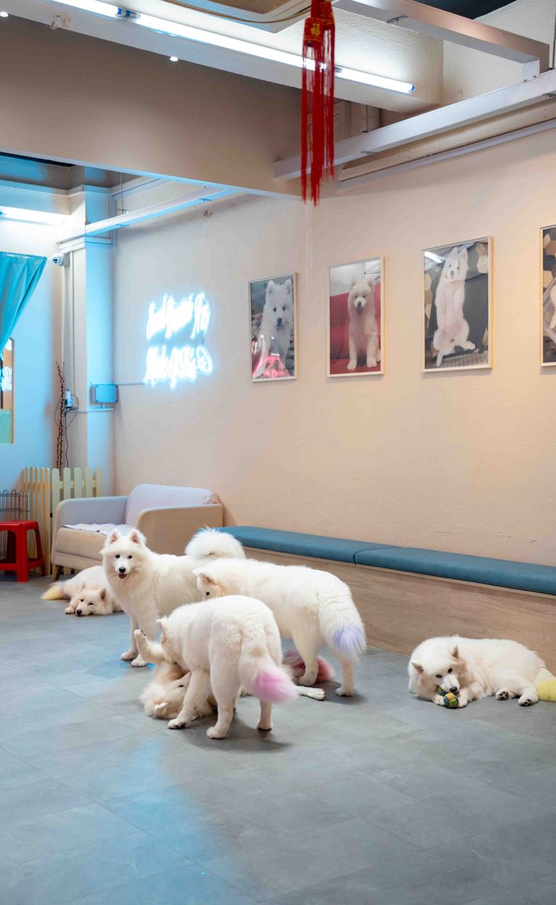 Snow Pawttage specialises in only pure Samoyed dogs, the first-ever in Singapore to specialise in the rare breed. There are 8 energetic dogs housed in the café so far, with both male and female dogs aged between 7 months to 5 years. Since the Samoyeds’ fur is all white, you’ll notice that they have coloured tails so it’s easier to identify them by name!