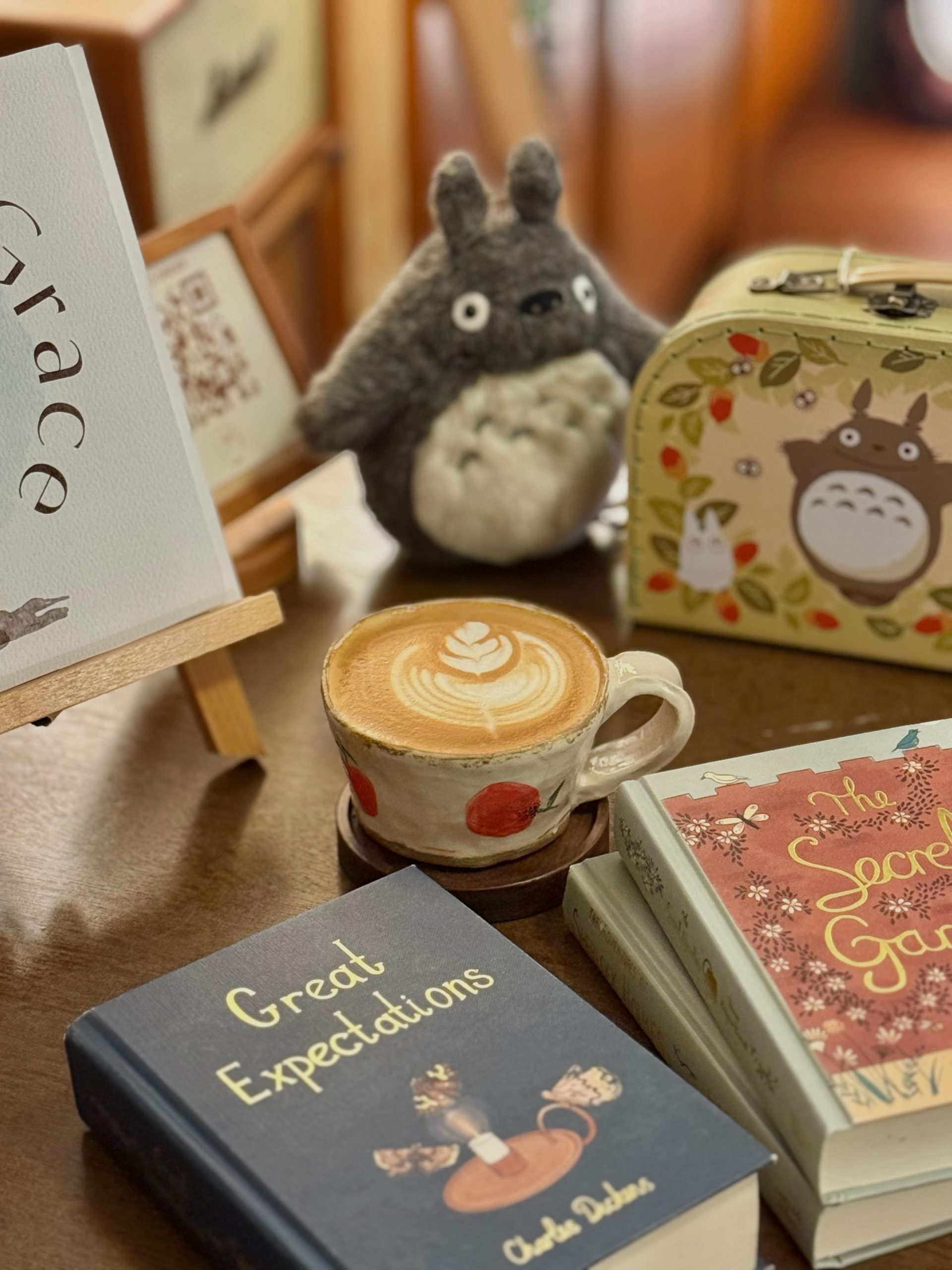 The café features a Studio Ghibli theme as the owner herself is a fan of Studio Ghibli—even her cat is named Totoro. The space itself is dimly-lit, with a warm and inviting ambience and cottagecore-inspired elements. Every aspect and element of the cottagecore-esque space is intentional and well-thought out, made to make guests relax and feel at home.
