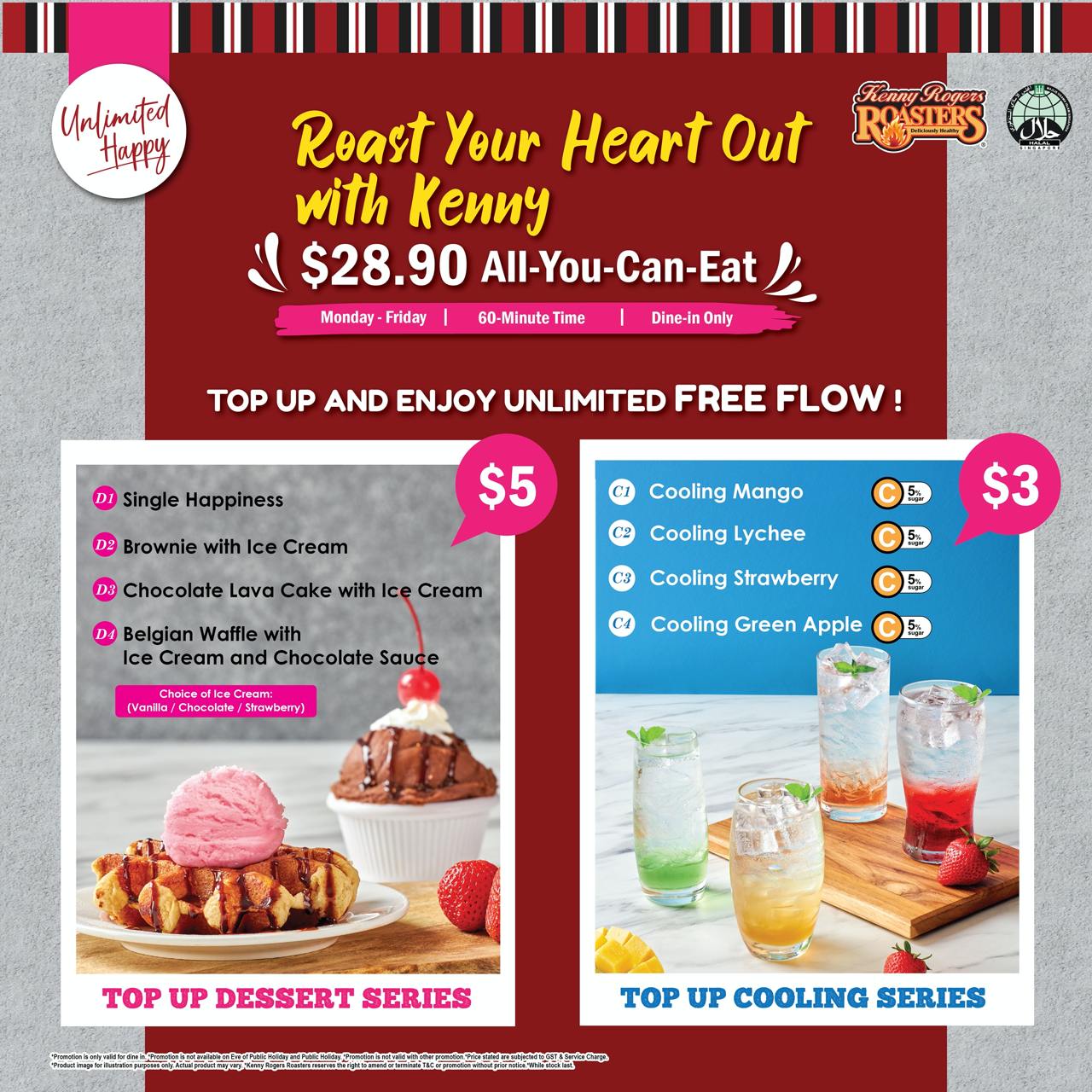 The new à la carte buffet at Kenny Rogers lets you feast on over 15 items, with unlimited roasted and fried chicken, sides and soft drinks. Enjoy free flow servings of items like Rotisserie-Roasted Chicken, Crispy Golden Chicken (Original/Spicy), Macaroni & Cheese, Mashed Potatoes, Potato Salad, Nasi Lemak Rice, Onion Rings, Fries, Signature Corn Muffins and more. The buffet also includes free flow soft drinks like Coke.