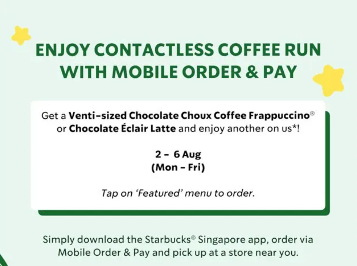 From 2nd to 6th August 2021, enjoy 1-for-1 promotions on selected handcrafted drinks at all Starbucks outlets islandwide! Available all day, throughout operating hours, this promotion invites customers to indulge in the brand’s Chocolate Choux Coffee Frappuccino, and Chocolate Éclair Latte at a discounted price!