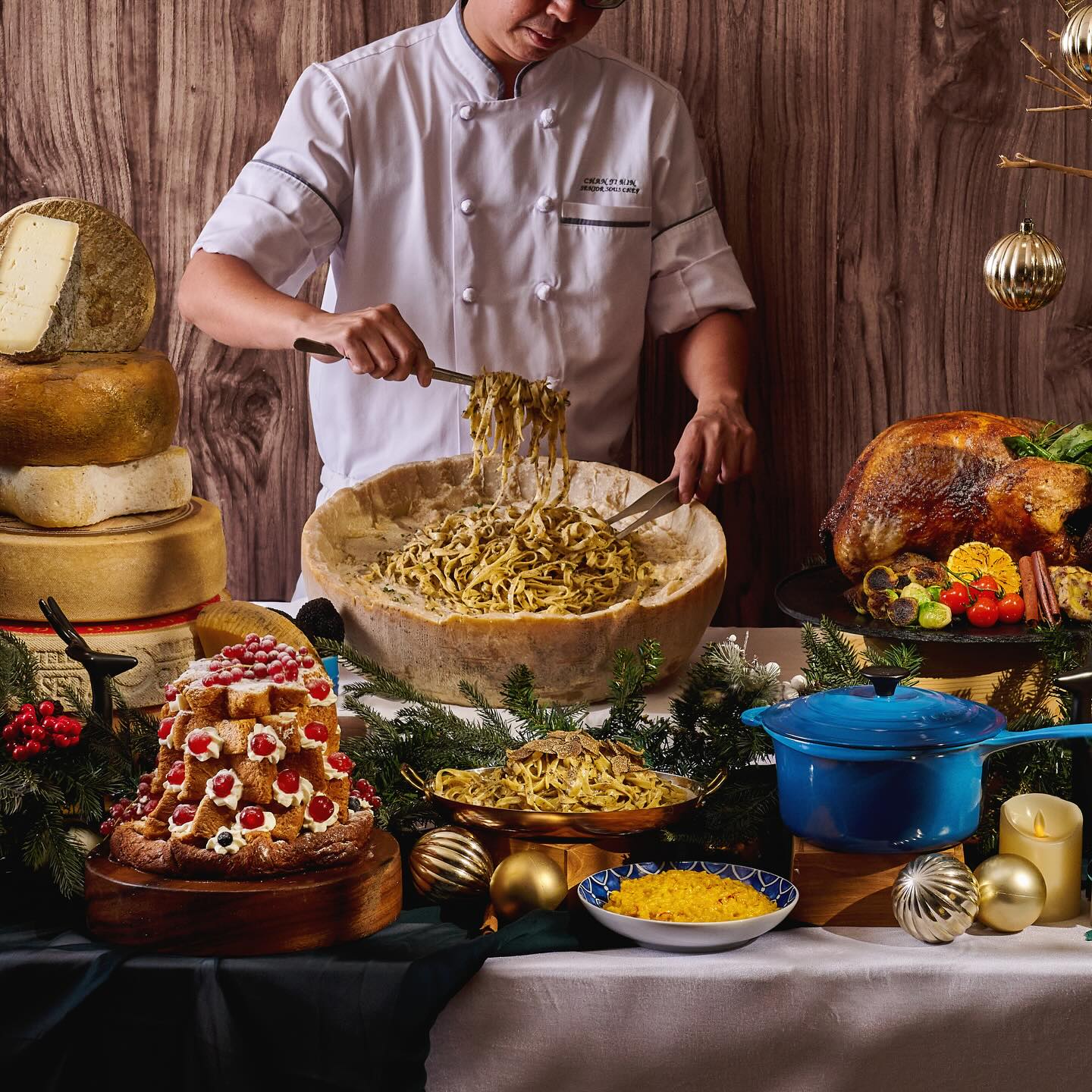 On the spread are highlights like Pistachio Mortadella, 24 Months Prosciutto, Wagyu Beef Meatballs, Wagyu Beef Lasagna, Grilled New Zealand Grass-Fed Sirloin Tagliata, Roasted Lamb Leg, Roasted Pork Belly, Crayfish, Crab Legs, Cheese Room selection, Traditional Tiramisu and more.