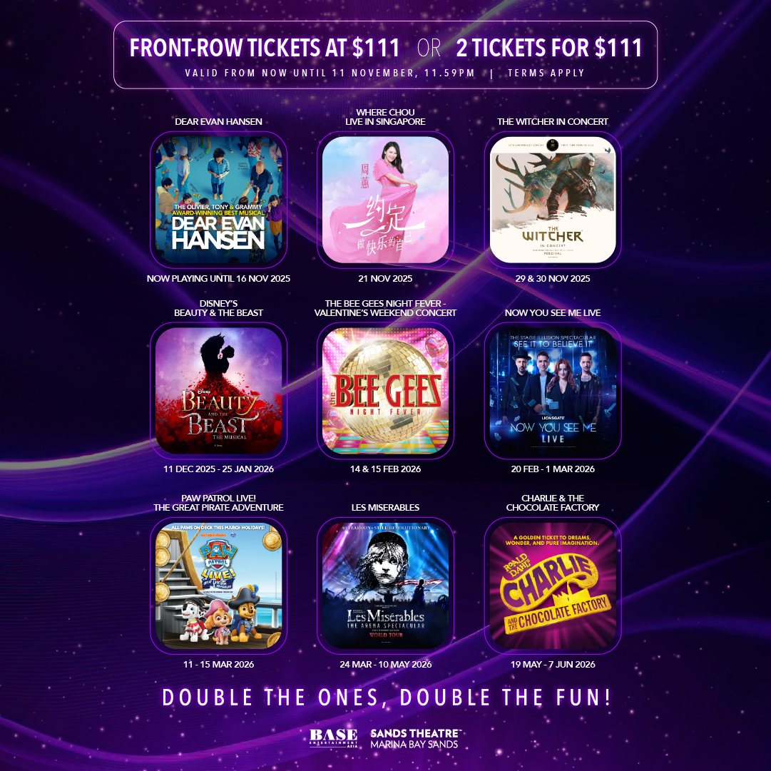 Choose from popular showings and performances including Les Misérables, Beauty and the Beast, Dear Even Hansen, Charlie and the Chocolate Factory, Now You See Me Live, The Bees Gees Night Fever and more. You can browse the full selection of shows applicable and book your tickets here. Sistic’s 11.11 ticket promotion is ongoing from now till 11th November 2025, 11.59pm.