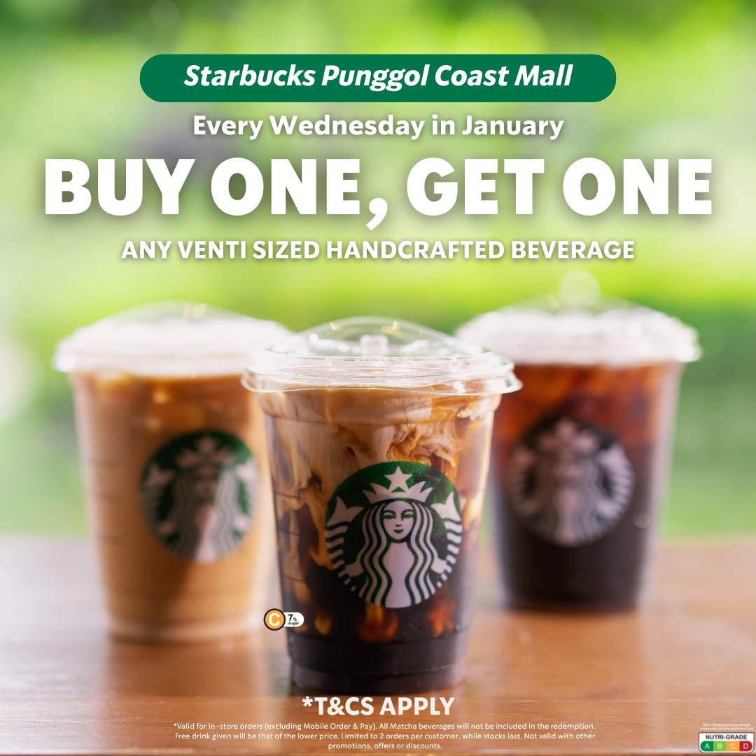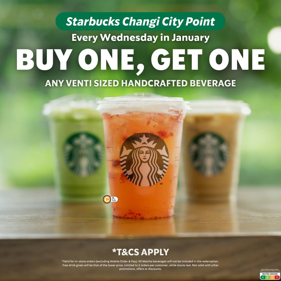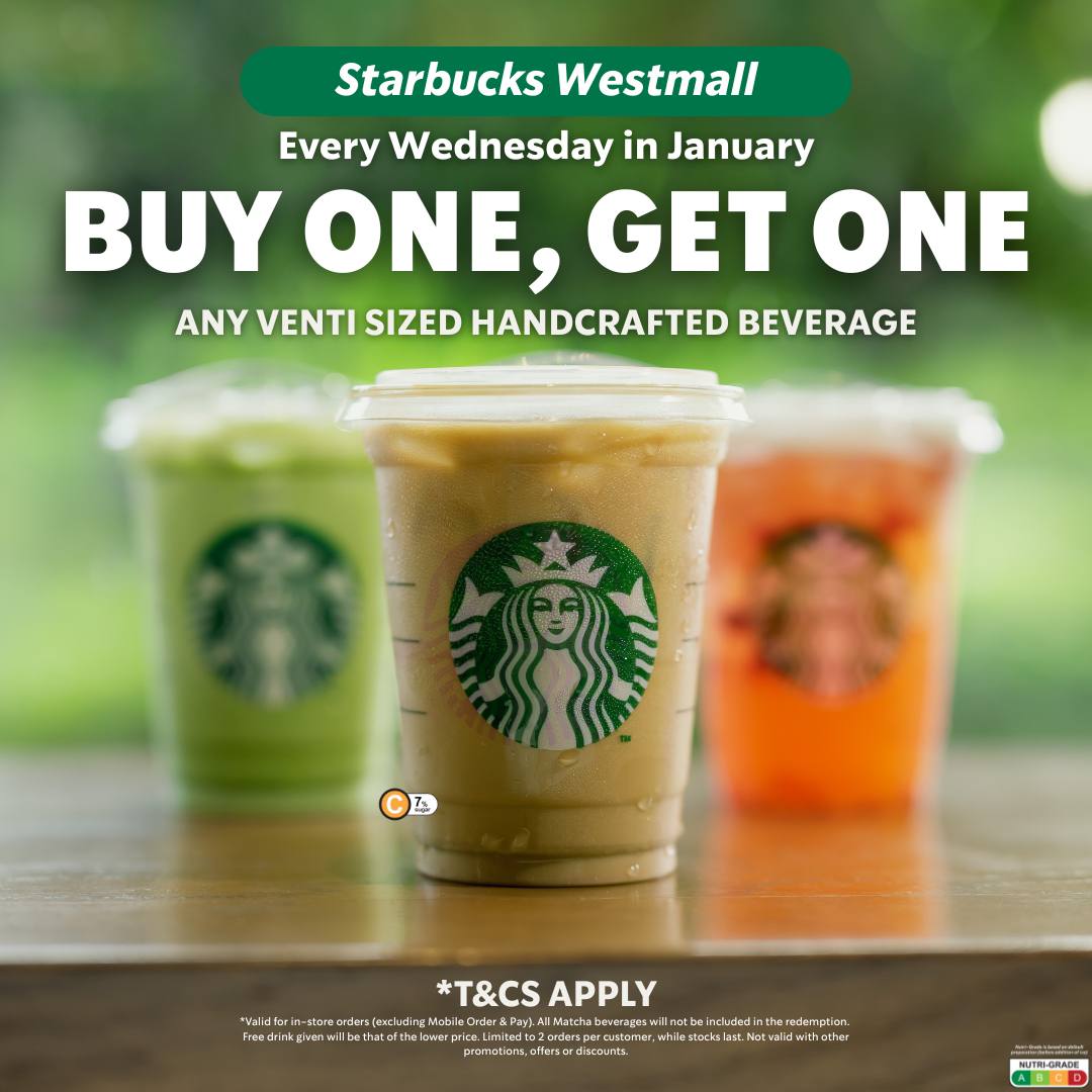 If you’re near Westmall, Changi City Point or Punggol East Mall, you can claim a 1-for-1 deal on any Venti-sized Starbucks drink on the menu. This 1-for-1 deal is available every Wednesday, only for the month of January 2026. The 1-for-1 is available every Wednesday in January 2026, from 10am to 8pm.