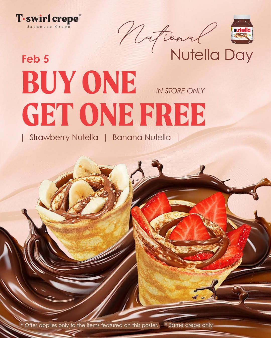 The 1-for-1 crepe deal is applicable to their nutella series, with options like Strawberry Nutella or Banana Nutella. With the discount, you’ll get to enjoy their regular-sized nutella crepes for just $4.95 each (UP. $9.90 each).
