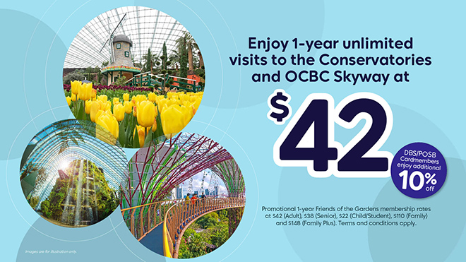 Get up to one year’s worth of unlimited admission to the Gardens By The Bay Conservatories and OCBC Skyway for a mere $42 (U.P. $68)! Available for a limited time only, this special promotion grants members unlimited admission to Cloud Forest, Flower Dome and OCBC Skyway, complimentary parking for the first 2 hours, exclusive privileges at the Gardens’ gift shops and dining establishments, and members-only invites to unique experiences, events, workshops and more.