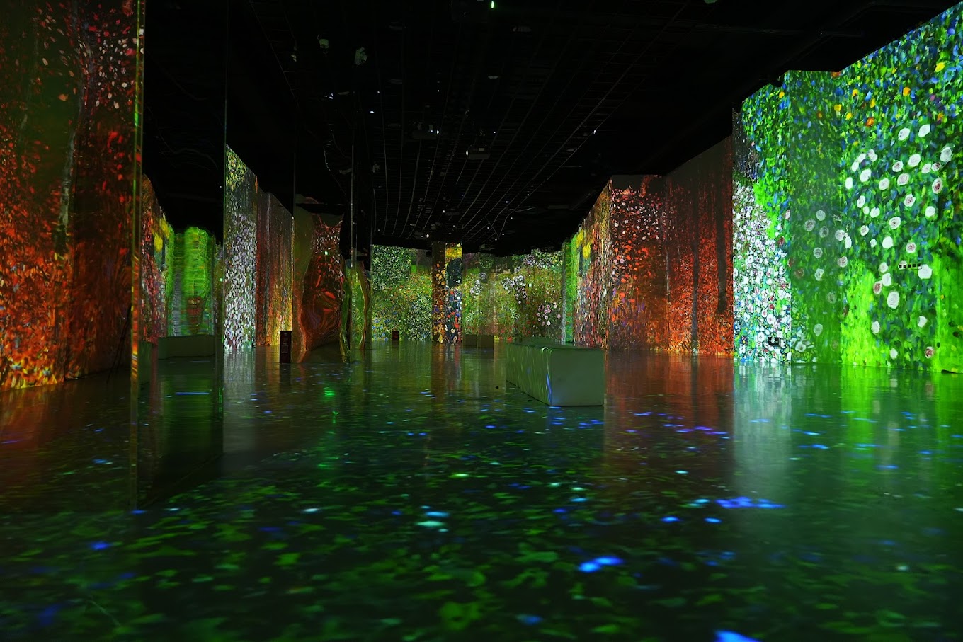 Highlights from the experience include his iconic The Kiss artwork, 360-degree projections acoss 7 unique rooms, a virtual reality and interactive AI experience, shiny gold “tunnels” and more.