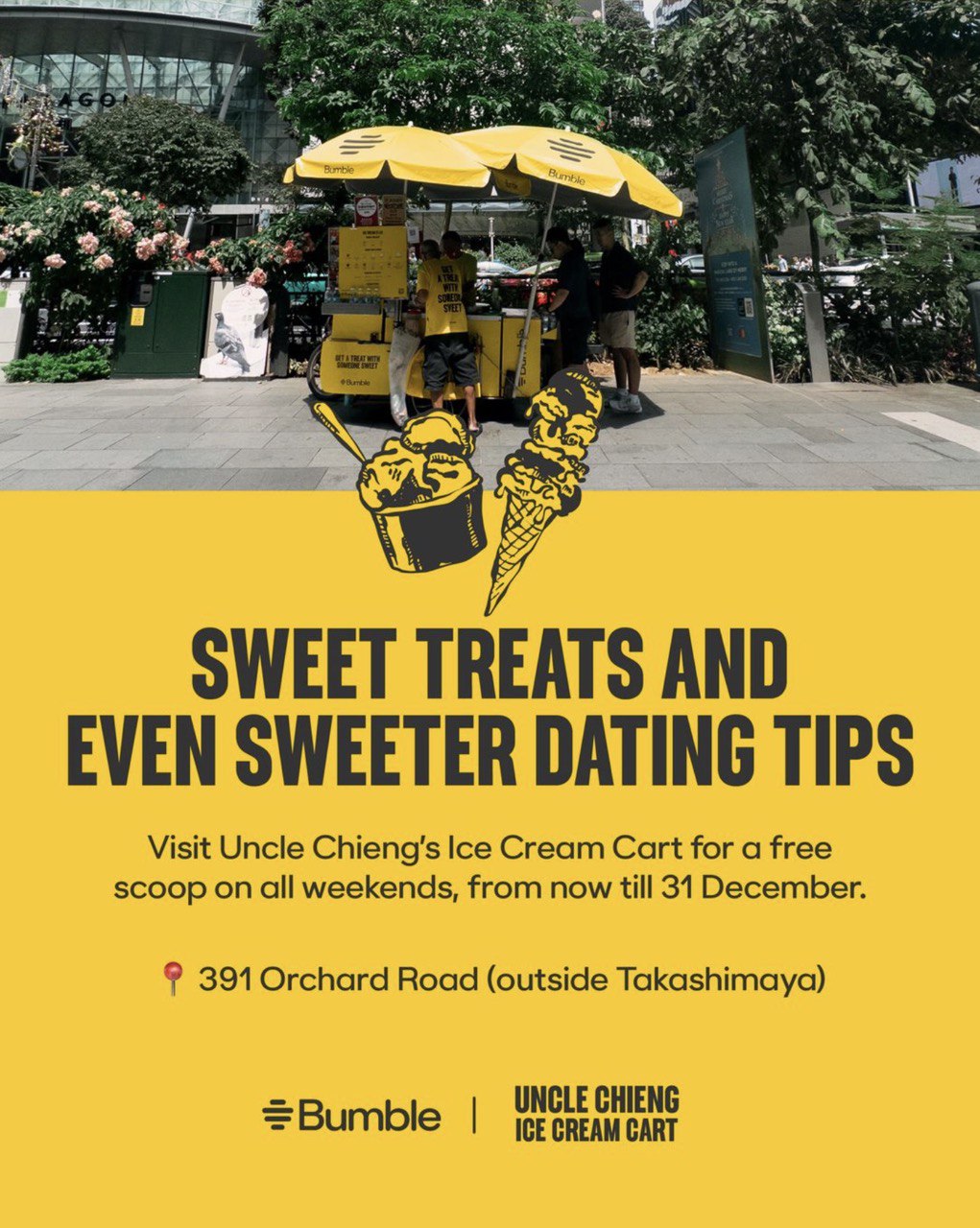 Spot the ice cream cart stationed along Orchard Road outside Takashimaya and redeem your free scoop just by showing your Bumble profile. Redemptions are available only on weekends from now till 31st December 2024.