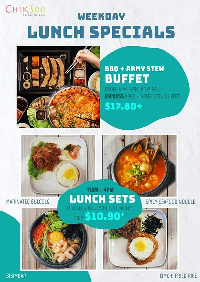 Other promotions include daily 90 minute dinner buffets worth $24.90 per person, and $10.90 lunch sets with free flow lemon tea and barley. What’s more? Get an additional $5.60 cash voucher when you dine-in from now till the end of August at ChikSoo Korean Kitchen!