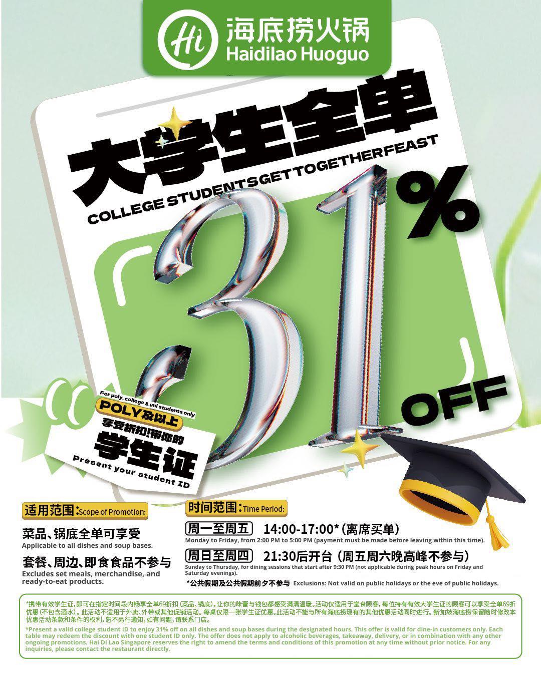 For a limited time only, you can enjoy 31% off all dishes and soup bases at any HDL outlet in Singapore. As long as you can present 1 valid student ID (polytechnic, college and university student IDs), the entire table and all its members will get 31% off their HDL feast. Yes, that even includes 31% off meats, seafood and more.