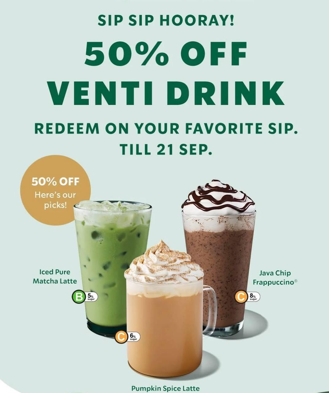The 50% off Starbucks deal is applicable only to their Venti-sized drinks, and exclusively for Starbucks Rewards members; you’ll find the exclusive voucher in your account. If you’re a Starbucks member, make sure to check your account for 50% off your favourite Venti drinks at any outlet from now till 21st September 2025.