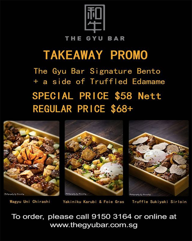 Get any one of three Gyu Bar signature bentos in Wagyu Uni Chirashi, Yakiniku Karubi & Foie Gras, and Truffle Sukiyaki Sirloin for a mere $58 (U.P. $68). Complete with a free side of Truffle Edamame, this promotion will run for a limited time only. To order simply visit the Gyu Bar’s official website or call 91503164!