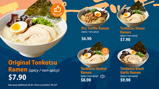 Discerning guests can expect to enjoy a variety of innovative and classic dishes such as the $7.90 Original Tonkotsu Ramen, $9.90 Tonkotsu Black Garlic Ramen, $7.90 Tonkotsu Shoyu Ramen, $8.90 Tonkotsu Gyokai Ramen, and most notably, the all-new $6.90 Dry Truffle Ramen with stir fried shredded pork topped by in-house made sauce and truffle oil!