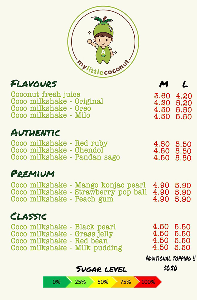 Their drinks, categorised into five distinct series known as the ‘Fresh Milk Series’, ‘Coconut Latte Series’, ‘Bubble Coconut Series’, ‘Shake Signature Series’, and ‘Fresh Juice Series’, include a $5.30 Coconut Strawberry Shake, $5.50 Coconut Avocado Shake, $5.90 Coconut Cappuccino Shake, $4.90 Bubble Taro Coconut, $4.90 Bubble Chocolate Coconut, and $4.60 standard Fresh Coconut Juice. Other offerings include a $4.90 Coconut Ice Cream, $2.50 Coconut Yoghurt, $4.60 Coconut Soft Serve, and $2.80 Coconut Pudding.