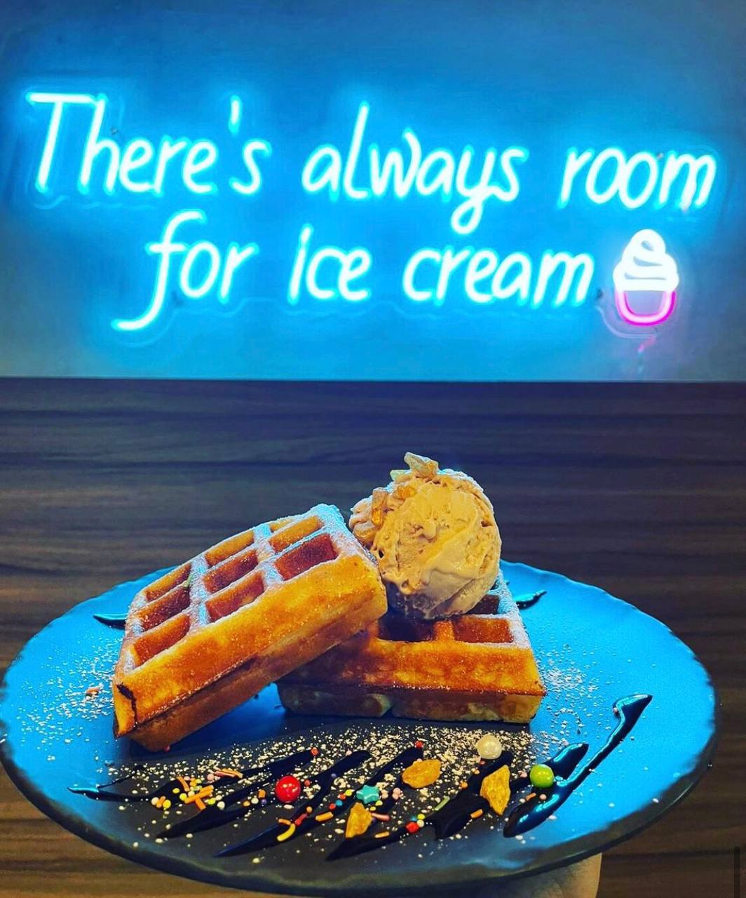The Ice Cream & Waffle carefully decorated with Icing Sugar, chocolate sauce, and rainbow sparkles. Source: Foursome Ice Cream & Waffle