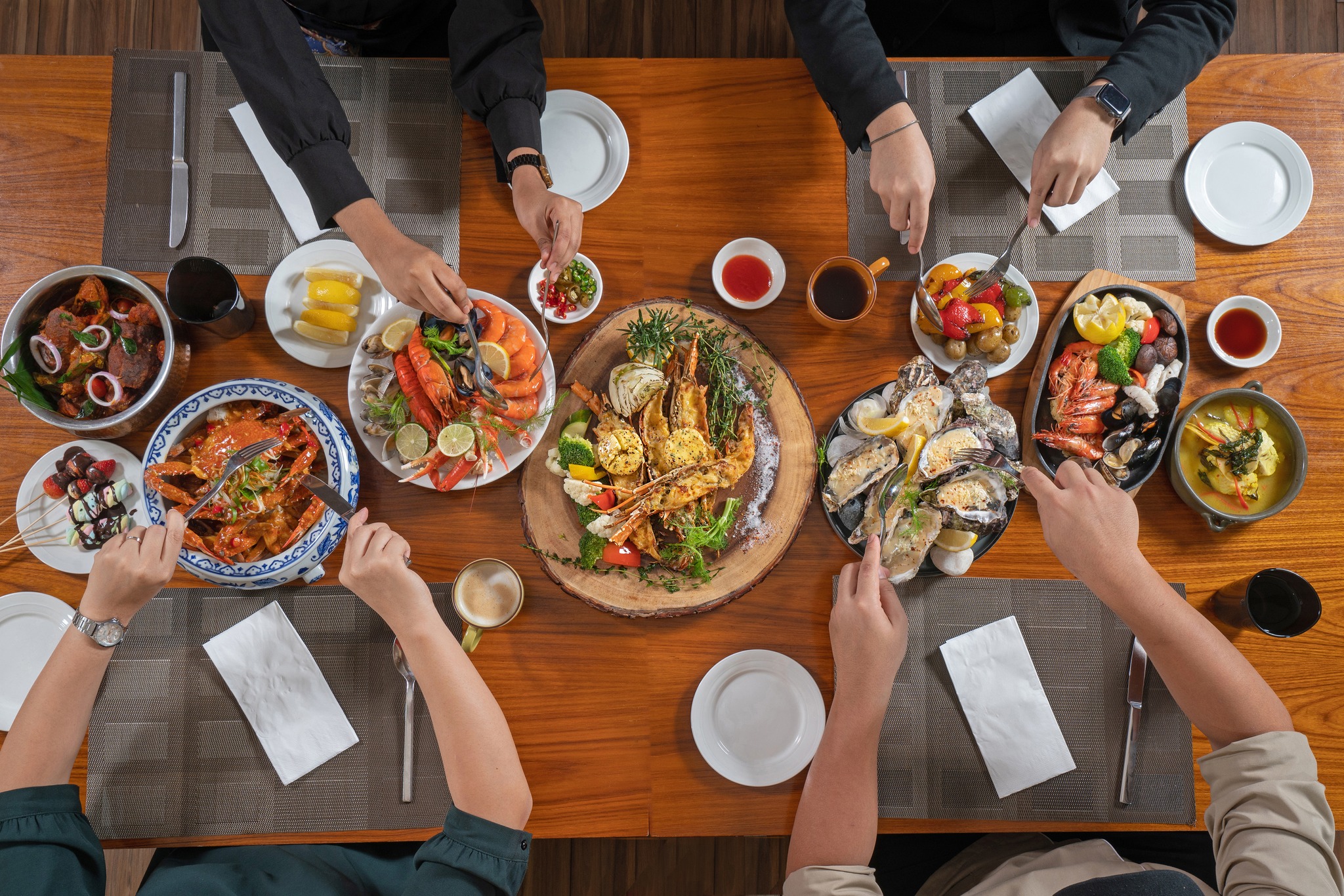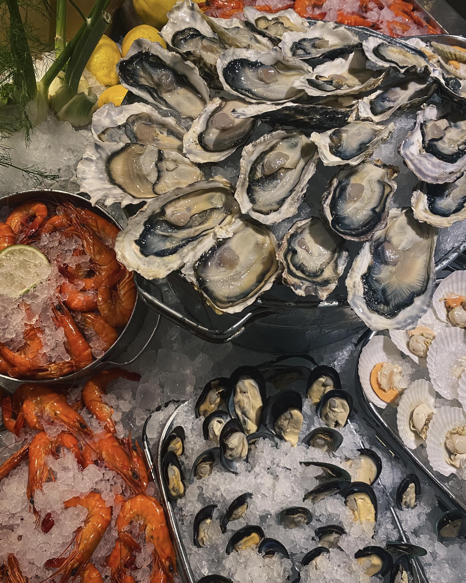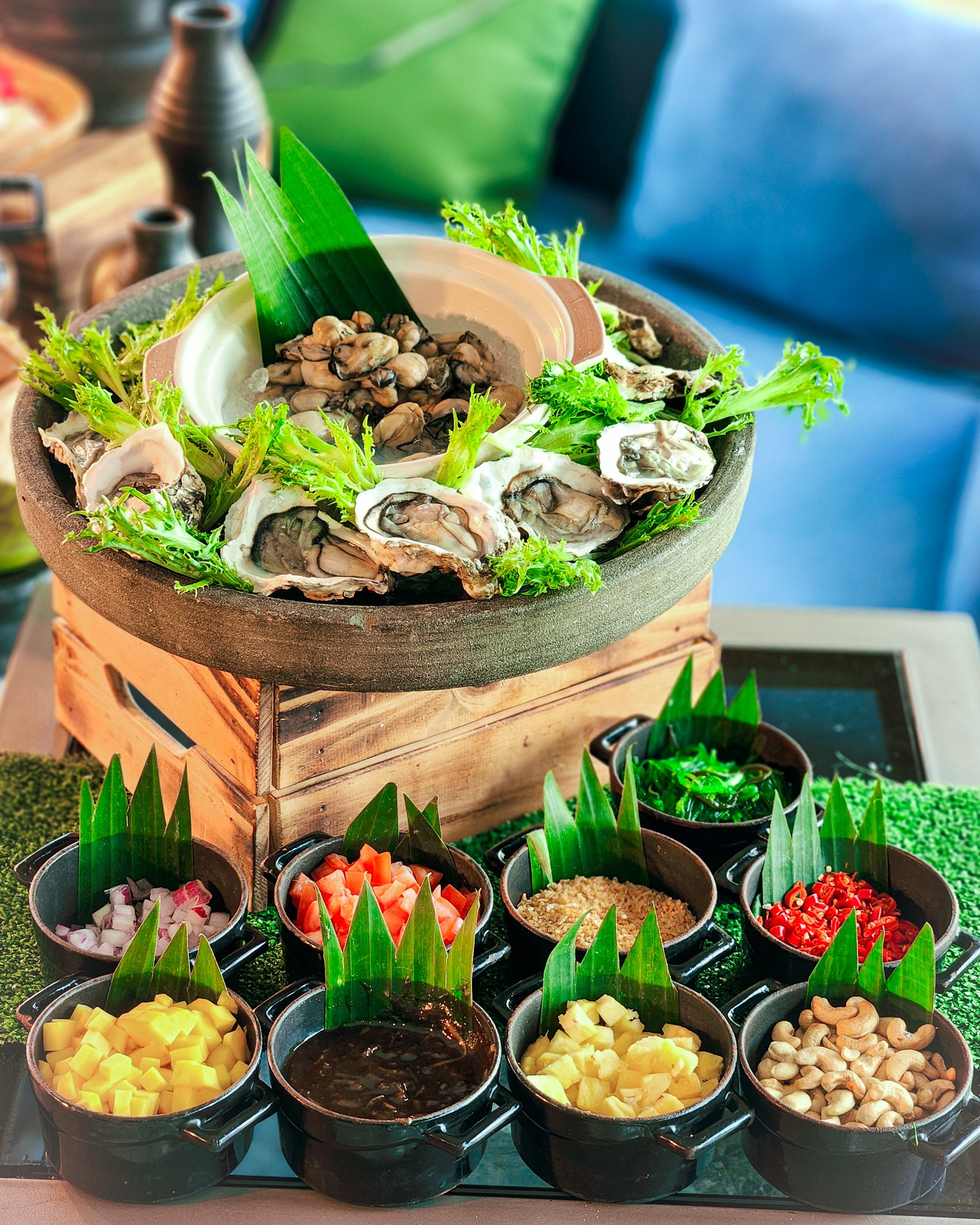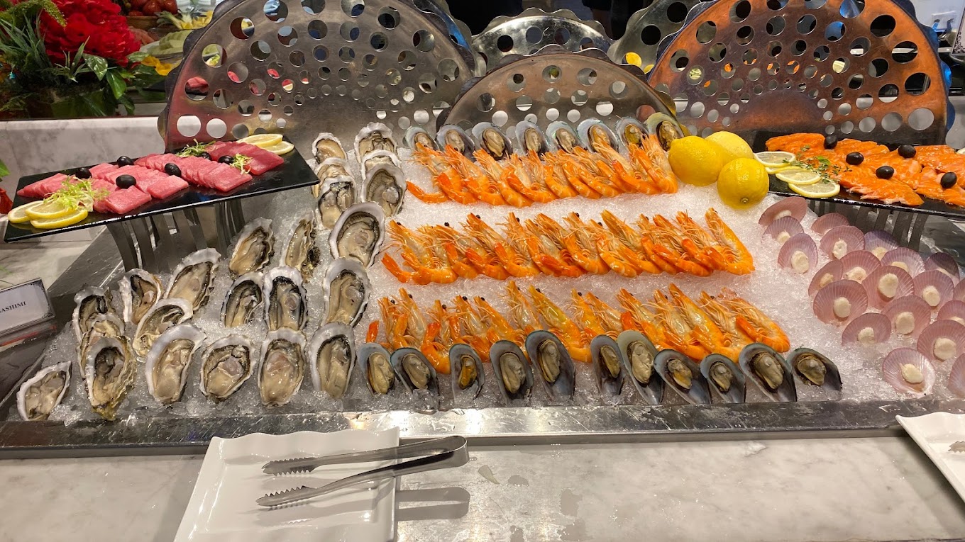 Look forward to seafood on ice like fresh oysters, prawns, mussels, scallops and sashimi, plus various cooked dishes like grilled satay, roast beef, curry fish, roast duck and more.