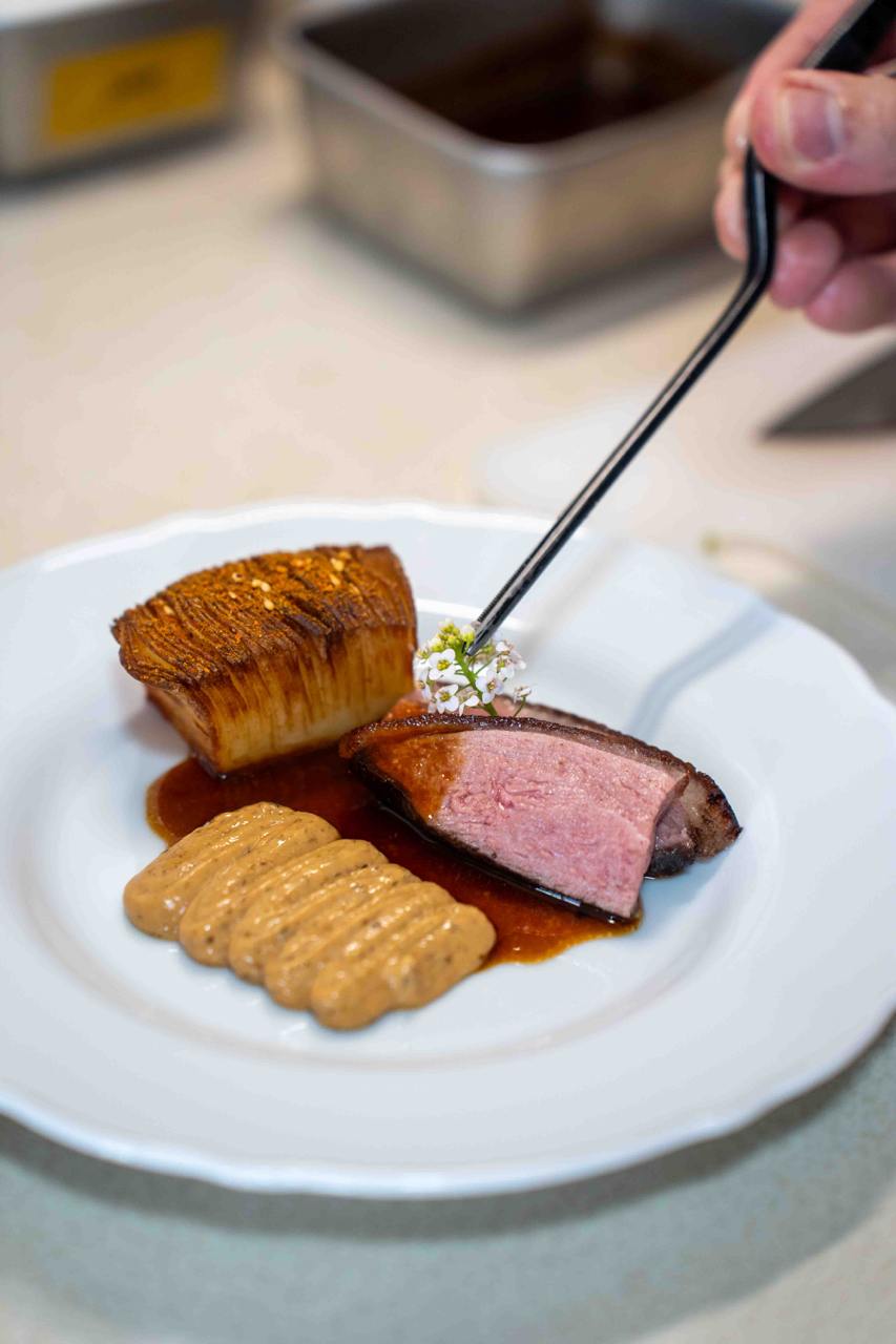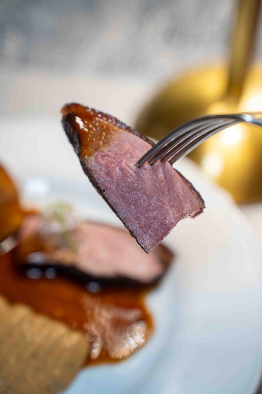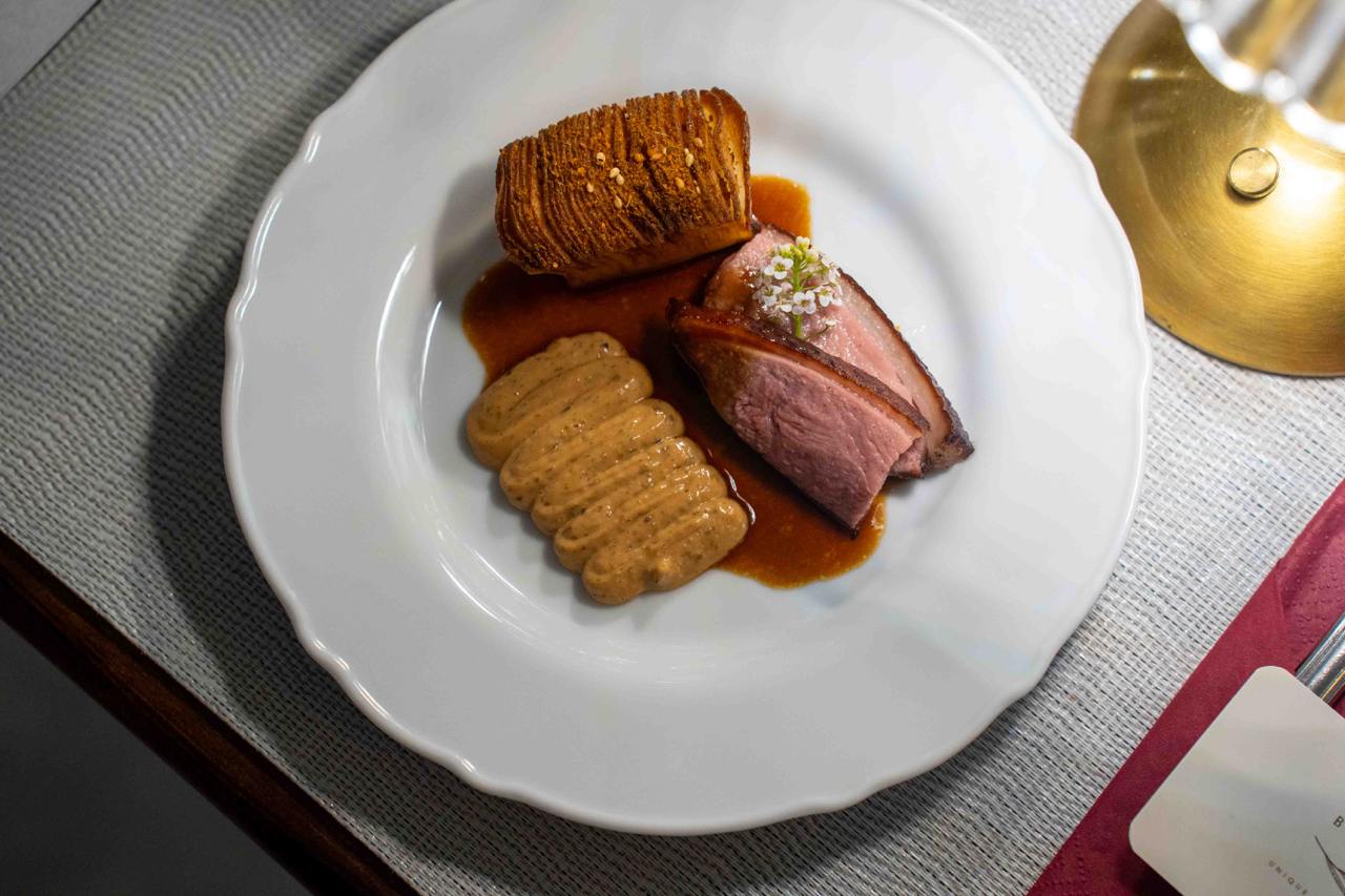 Then you have a second starter, a warm one this time: Salmon tartare that’s done with a Chinese twist. There’s a whole lot of flavours and textures at play here: citrusy tartness, crisp vegetables, aromatic spiciness and more. The salmon is mixed with a homemade Chinese chilli jam and 10-year aged Shao Xing beurre blanc; it’s got a spicy kick and an addictive crunchy texture thanks to the freshly-toasted brioche it sits on. Next comes the first main course: a crispy Duck dish made with 48-hour aged duck that’s been slowly pan-fried until you get that glistening crust on the skin. The duck has also been spiced with a Chinese 5-spice and drizzled with a homemade juniper berry hoisin sauce. Aside from the duck itself, what actually stood out for us is the side of crispy hasselback potatoes. The hasselback is thrice-cooked for maximum crunch, and sprinkled with a house-made BBQ seasoning powder; and we just love the combination of crunchiness outside and fluffy insides.