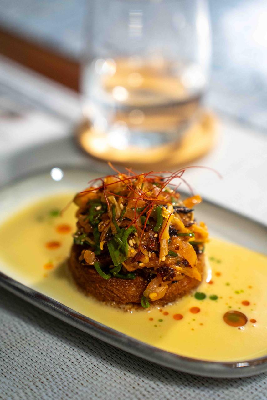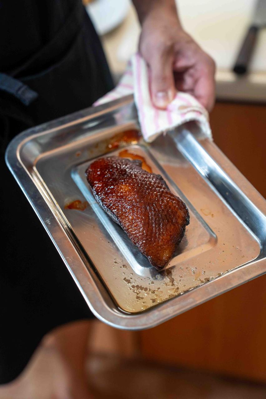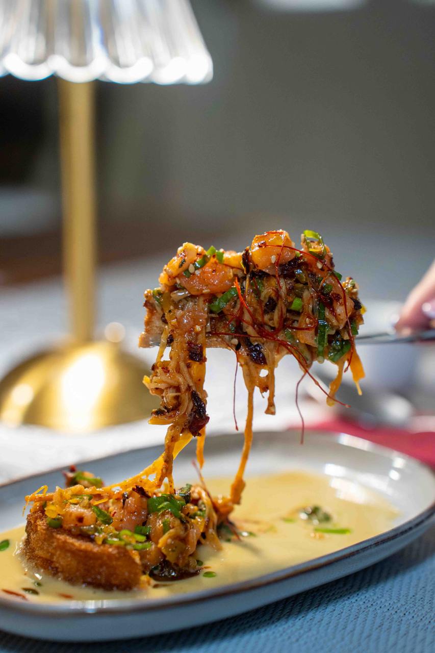Then you have a second starter, a warm one this time: Salmon tartare that’s done with a Chinese twist. There’s a whole lot of flavours and textures at play here: citrusy tartness, crisp vegetables, aromatic spiciness and more. The salmon is mixed with a homemade Chinese chilli jam and 10-year aged Shao Xing beurre blanc; it’s got a spicy kick and an addictive crunchy texture thanks to the freshly-toasted brioche it sits on. Next comes the first main course: a crispy Duck dish made with 48-hour aged duck that’s been slowly pan-fried until you get that glistening crust on the skin. The duck has also been spiced with a Chinese 5-spice and drizzled with a homemade juniper berry hoisin sauce. Aside from the duck itself, what actually stood out for us is the side of crispy hasselback potatoes. The hasselback is thrice-cooked for maximum crunch, and sprinkled with a house-made BBQ seasoning powder; and we just love the combination of crunchiness outside and fluffy insides.